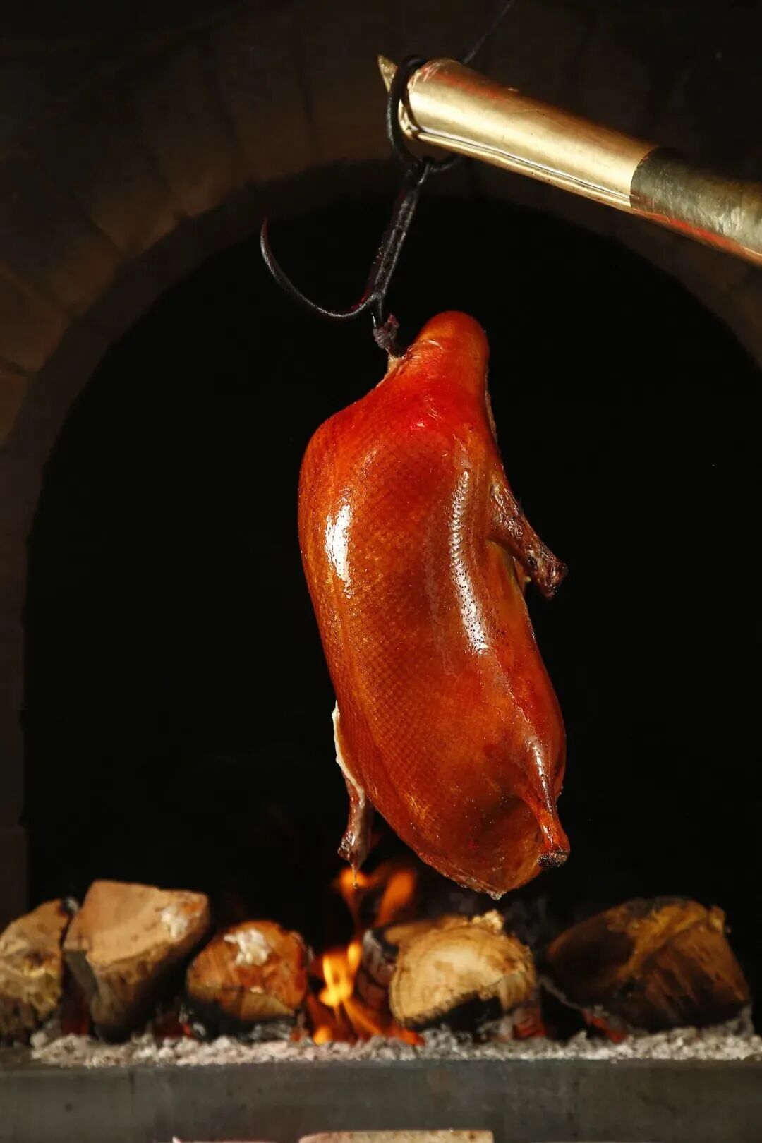 将鸭坯挂在特制的烤炉中明火烤制而成