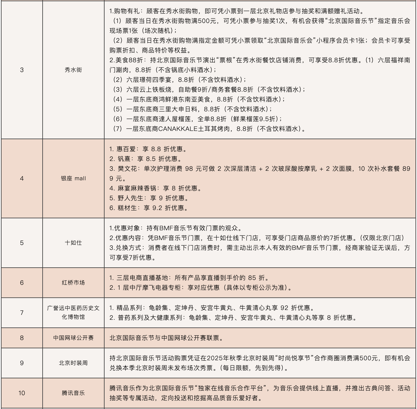 北京国际音乐节联动蓝色港湾、华贸购物中心、秀水街等优质商圈,推出音乐节票根专项优惠及购物有礼活动。消费者可凭音乐节票根在合作商圈享受优惠折扣,在指定商户消费满额即可赠送对应等级北京国际音乐节会员,还有机会免费获得音乐节门票及文创周边。此外,本届音乐节还将在重点商圈开展快闪音乐会等活动,实现音乐艺术与商业消费的深度融合。