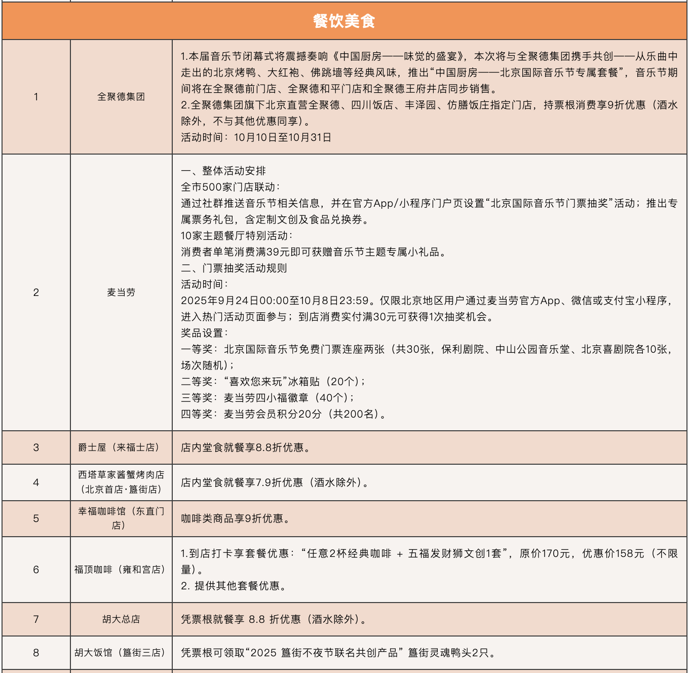 本届音乐节闭幕式将奏响《中国厨房——味觉的盛宴》,与全聚德集团携手共创——从乐曲中走出的北京烤鸭、大红袍、佛跳墙等经典风味,推出“中国厨房——北京国际音乐节专属套餐”,音乐节期间将在全聚德前门店、全聚德和平门店和全聚德王府井店同步销售。