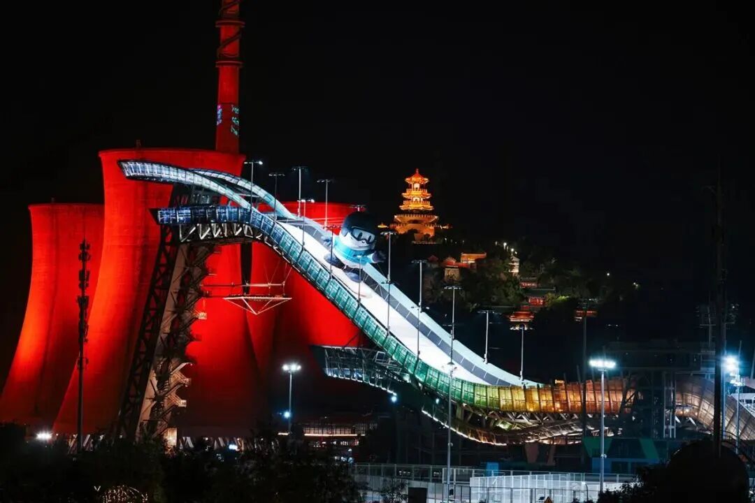 巨大的冷却塔、高耸的高炉漫步于群明湖畔看“冬奥大跳台”的优雅曲线倒映水中与月影交织。