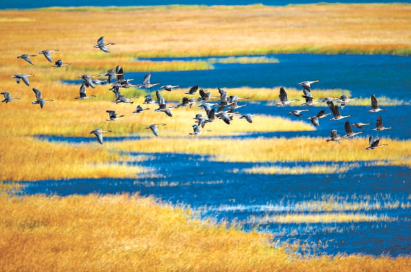 天气是鸟类迁徙最重要的因素,碰上雨雪或大风天气,候鸟就不爱长途飞行,也不愿意降落。“云破日出之后,鸟群能看清地面坐标,开始小规模降落。”李理说,很多鸟降落后都会张开翅膀,脚丫往前伸展着,做“刹车”动作。站稳后,它们会以家庭为单位钻进芦苇荡觅食。