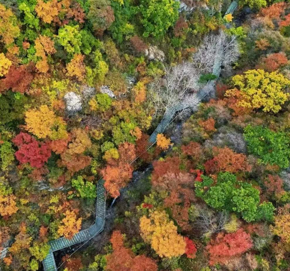 目前百瑞谷景区的彩叶已经进入观赏佳期,漫山遍野是红橙黄绿好似打翻了颜料盘。