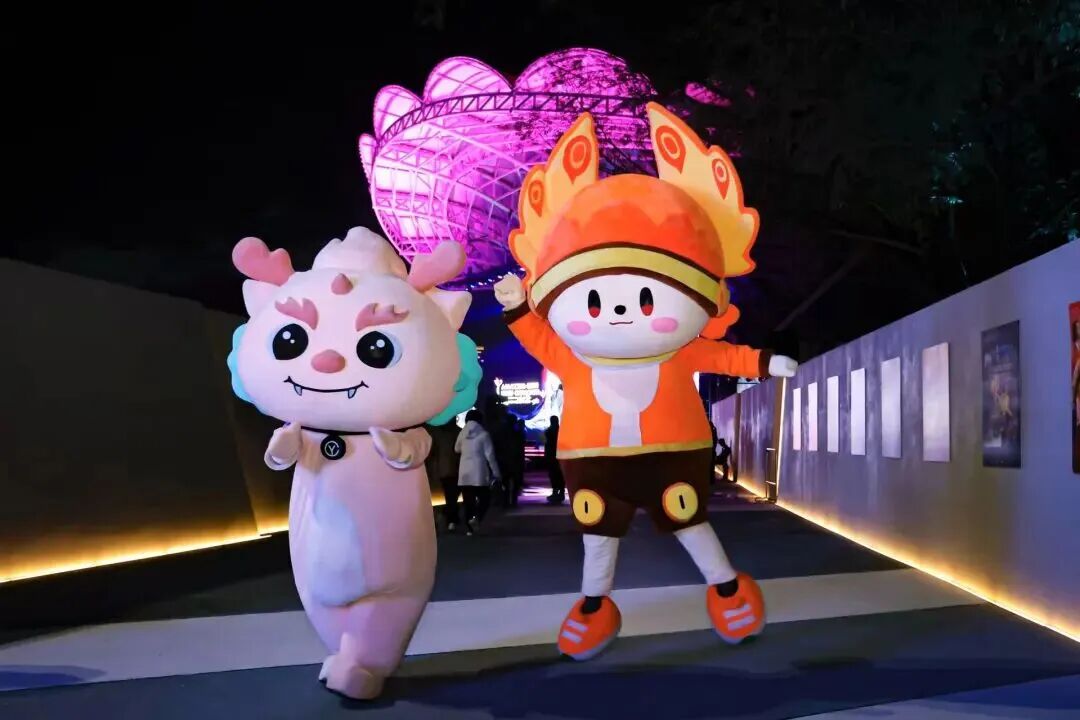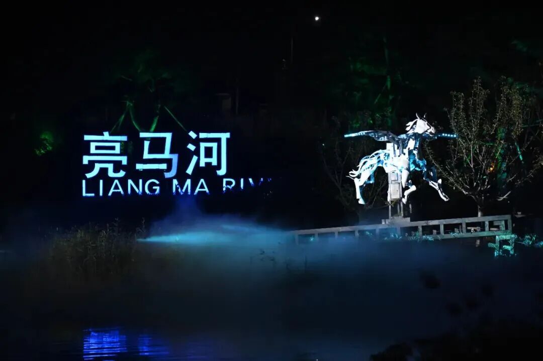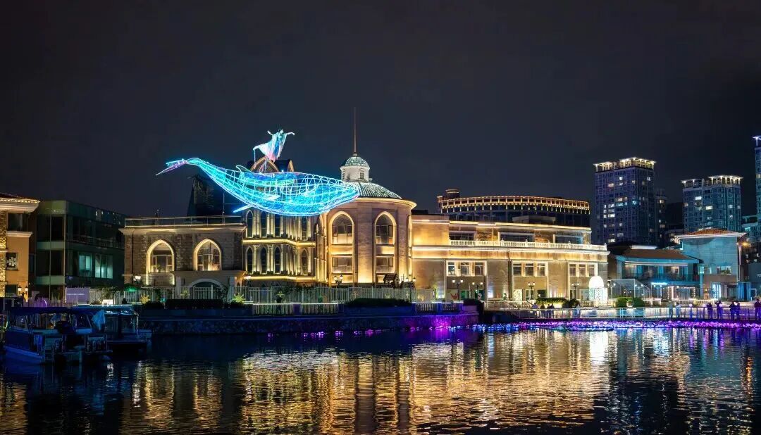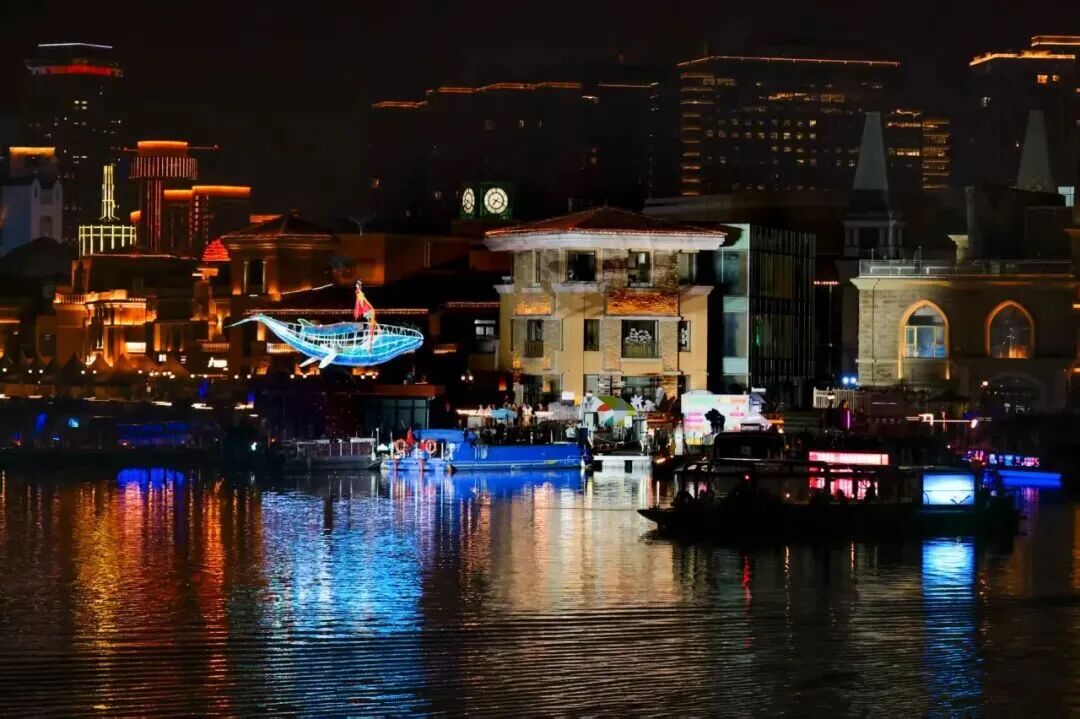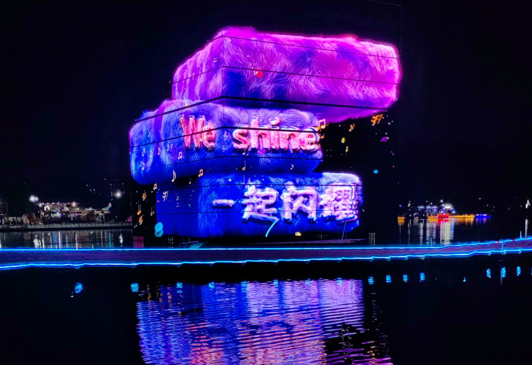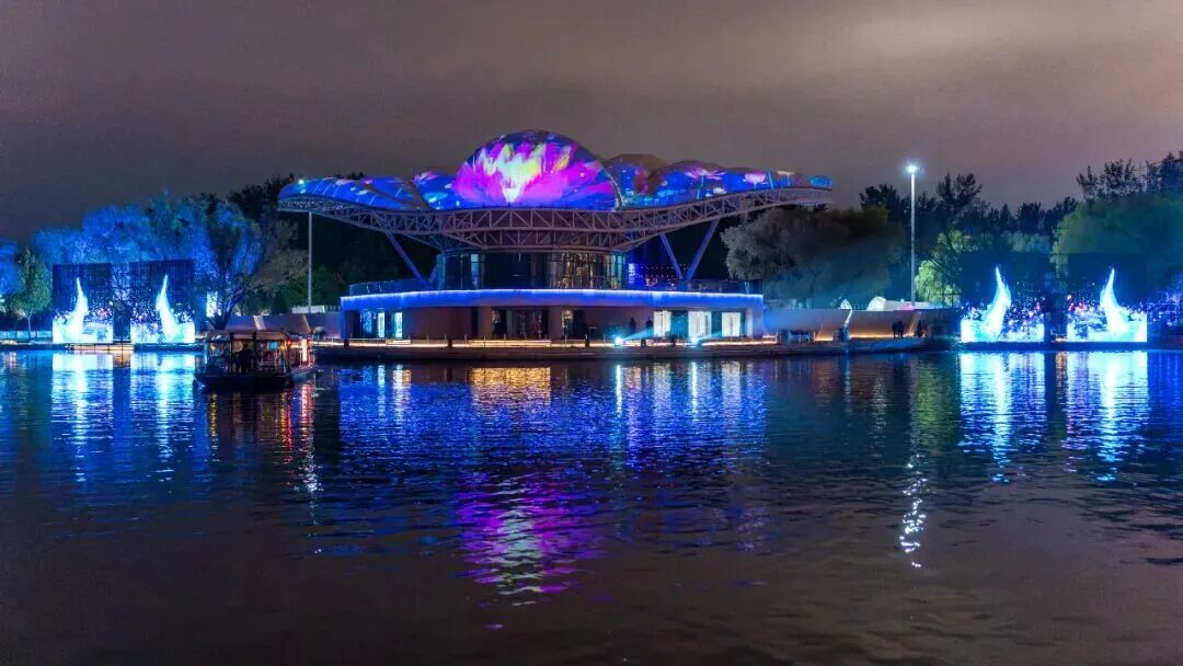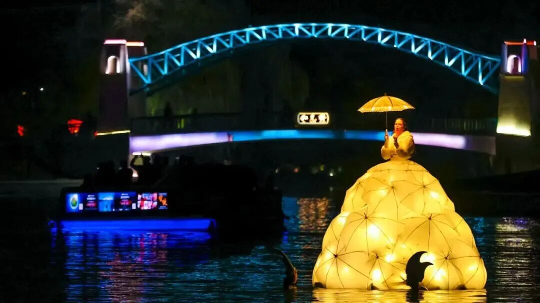 亮马河文化经济带及灯光消费季吉祥物“淇淇”“靓靓”惊喜现身,贝壳剧场化作浮光岛屿,舞台与河水连成同一幅柔光画布。