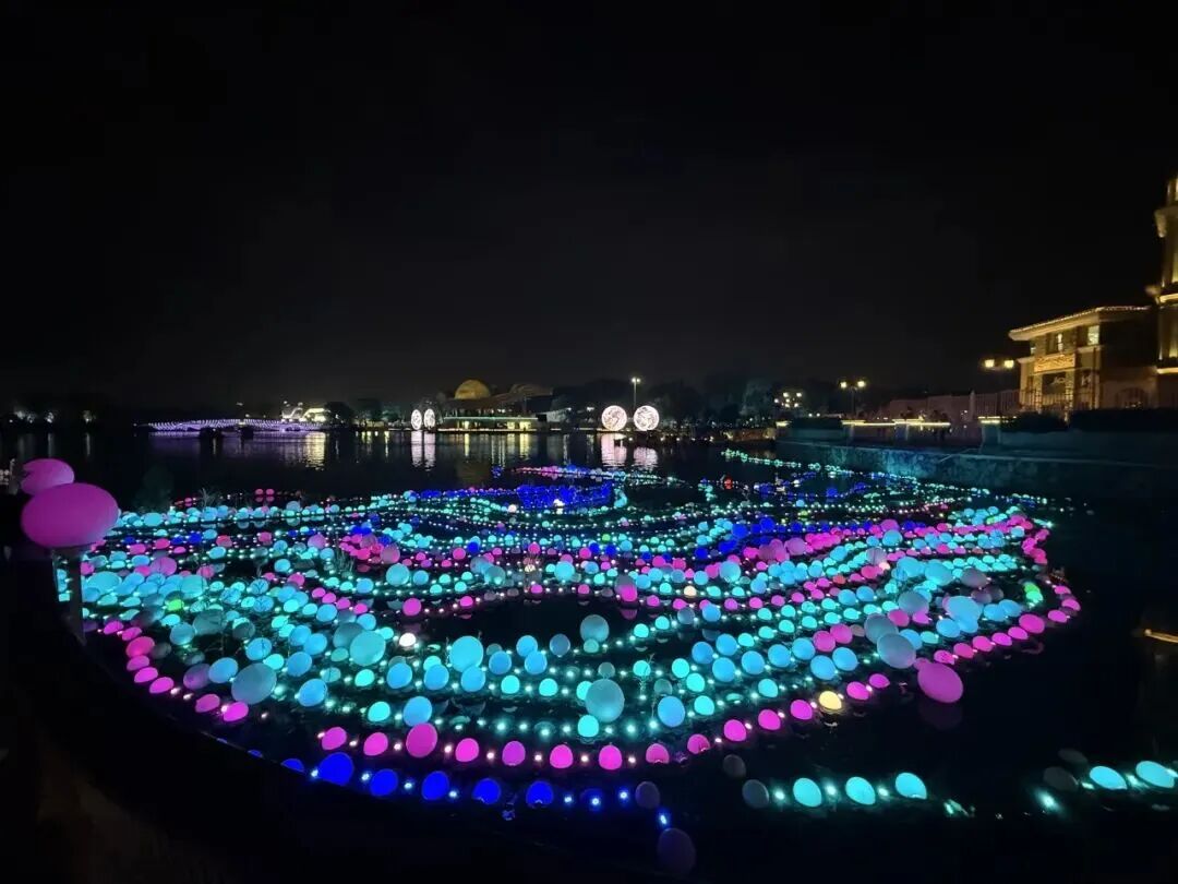 本届灯光消费季核心区域共设53处专属特色场景,含公开征集艺术装置9处以及5处大型光影秀。装置布于水面、水岸、地面、楼体,构成立体沉浸式夜游矩阵,邀请市民游客“一起SHINE”,共享朝阳璀璨夜色。