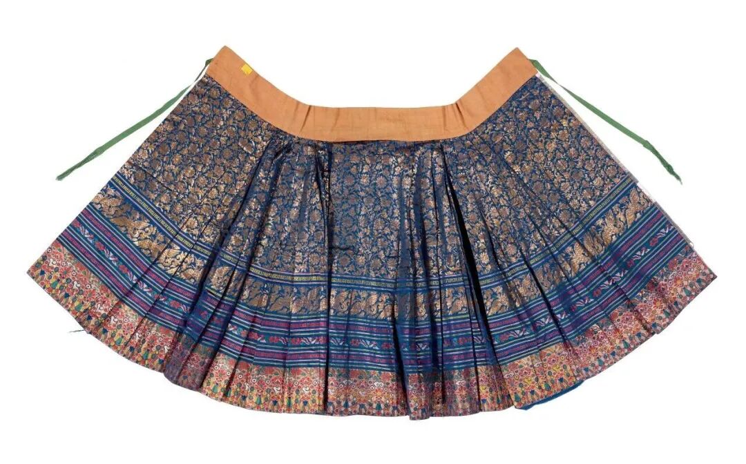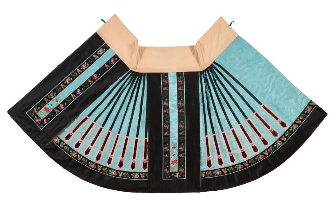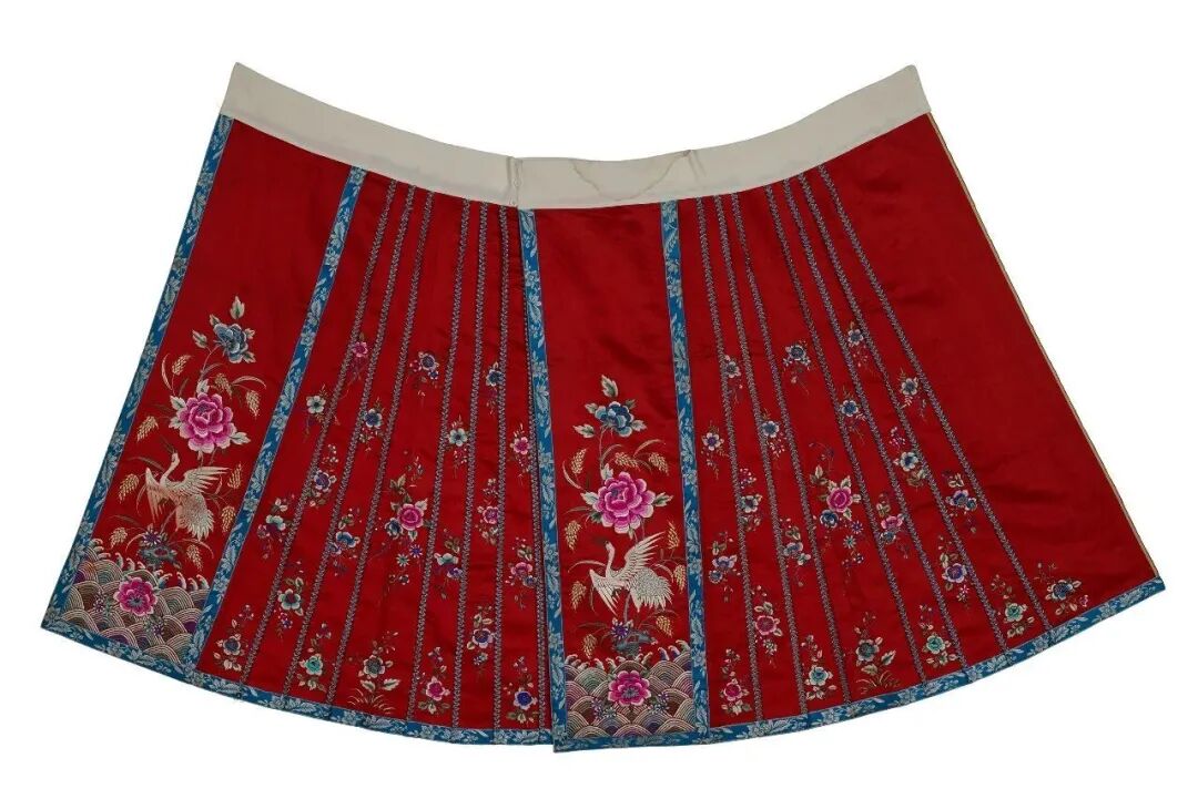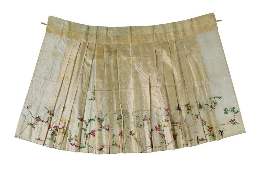 本展依据传统马面裙的美学演变为划分,始以序篇形式呈现出马面裙的形制起源,后以马面裙的定形与发展为题,共分为三个单元。第一单元“方兴未艾”,展示了明代马面裙及其同期的袍、袄等,力图呈现出明代马面裙的着装风采。第二单元“百紫千红”,展示了清代的阑干、月华、凤尾及百褶鱼鳞裙,辅以袄、褂,马面绣片等,呈现出清代丰富的裙型与华美的装饰。第三单元“简雅凝练”,展示了20世纪初在西风东渐下,马面裙形制及装饰上的简化。