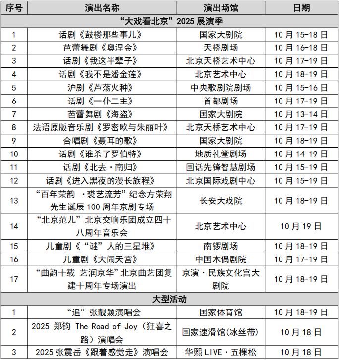 “大戏看北京”2025展演季以“文艺展新姿 精品献人民”为主题,重点推出精品大戏、梨园大戏、海外大戏、新锐大戏、演艺新空间、高校大戏六大展演单元,还将引入沉浸式体验、超高清第二现场等新型呈现形态,举办商圈戏剧市集等多种形式的活动。在为期三个月的时间里,好戏连台、全城有戏,80余家演出单位在30余家专业剧场、20多个演艺新空间呈现100部精品剧目,涵盖歌剧、话剧、芭蕾舞、戏曲等10余个门类,为中外艺术家搭建高端交流展示平台,为首都演艺市场注入澎湃动能。