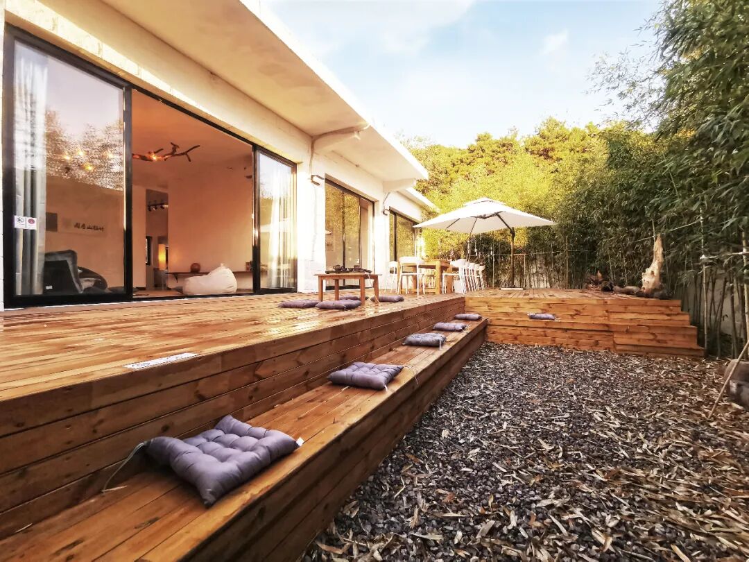 近百平方米的会客厅、五间不同的房间都有独特的气质。在屋顶露台上看山、看树、看花、看夕阳、看星星,伴着微风,伴着花香,伴着鸟鸣。