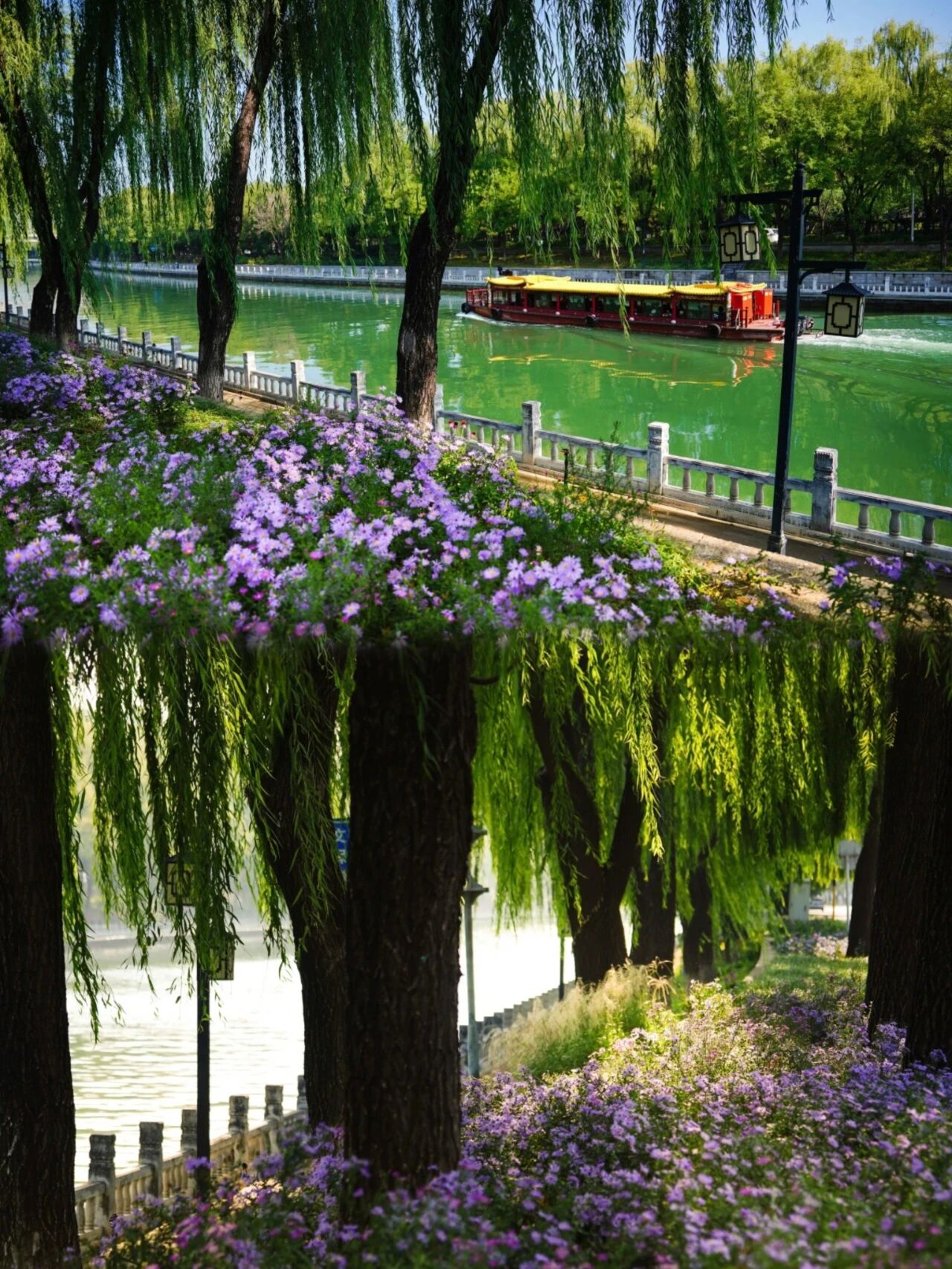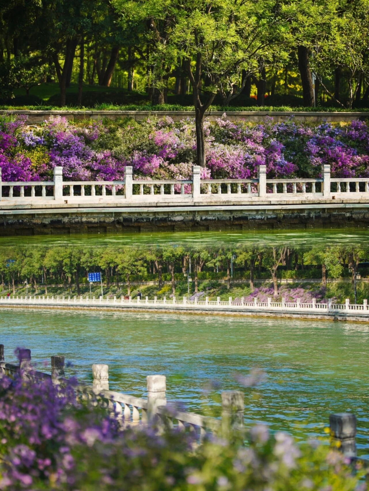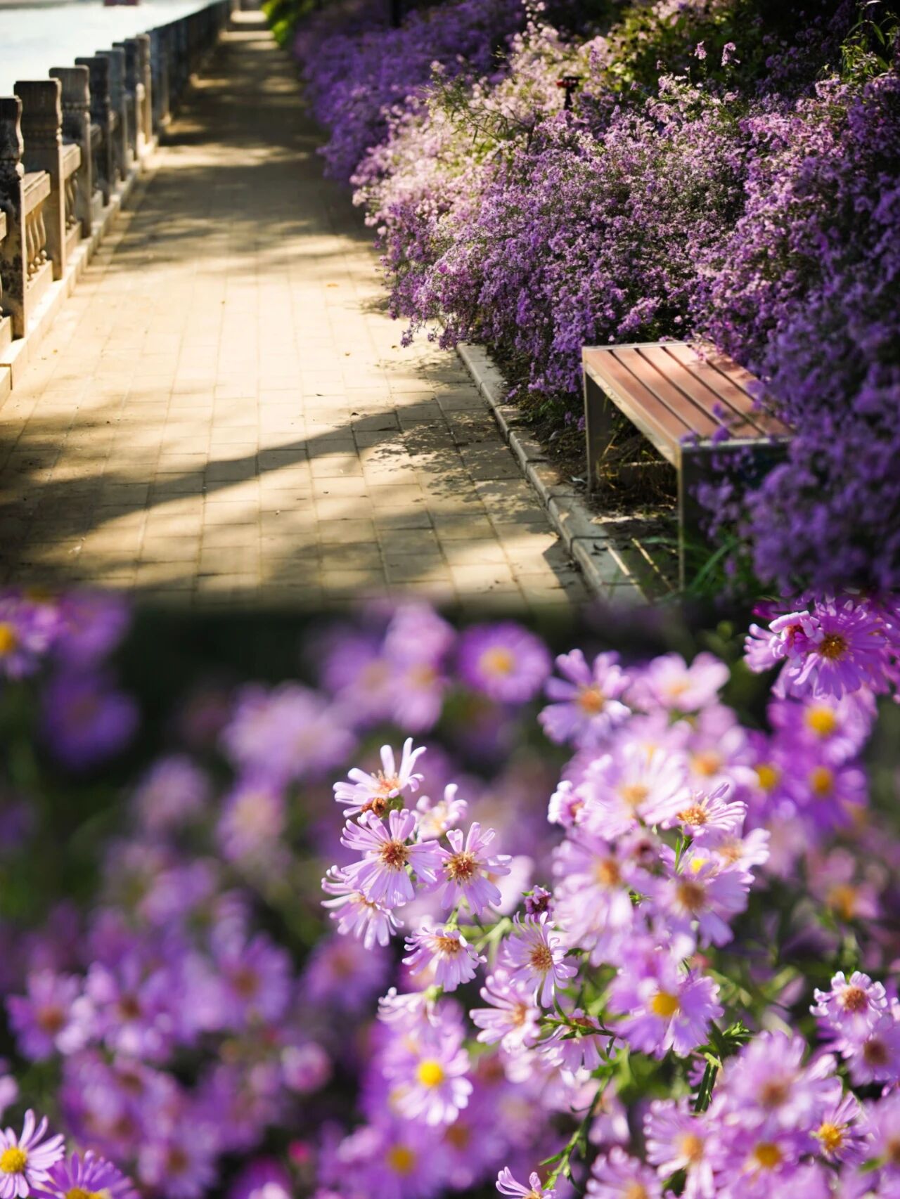 昆玉河畔秋色上新,碧波荡漾的河水畔,紫菀如烟霞铺展,甘野菊金黄夺目,荆芥摇曳着蓝紫色的花穗,与远处慈寿寺塔的飞檐翘角相映成趣,水岸边“流动的莫奈花园”具象化了!(图源:北京海淀)