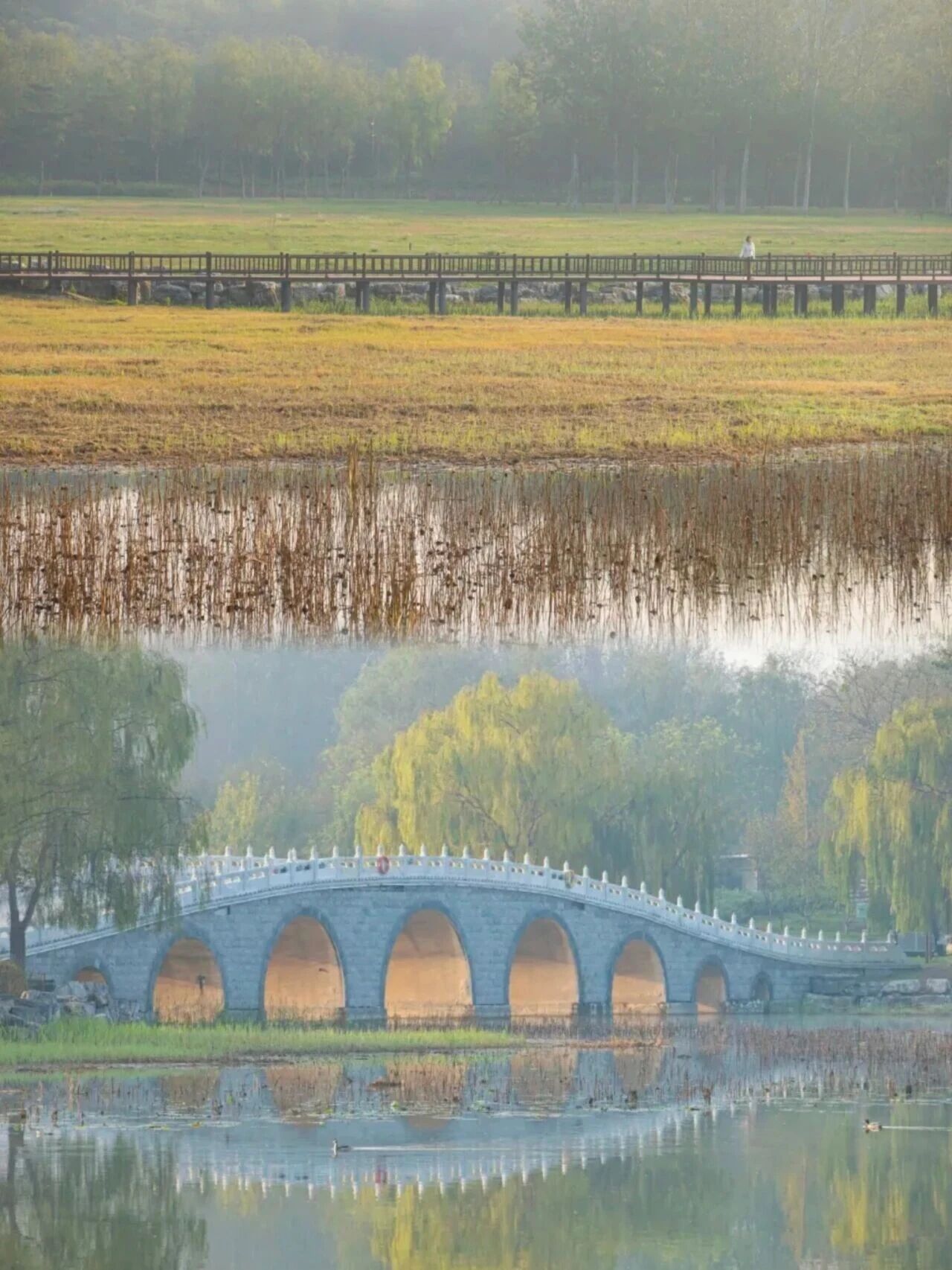 北京亦庄南海子公园的秋天是一幅灵动又绚丽的画卷,园内湖水澄澈,几只鸭子悠然游弋,荡起圈圈涟漪;石桥横跨湖面,桥身与水中倒影相映成趣;岸边柳枝泛黄,随风轻摆,似在与秋意嬉戏。(图源:北京亦庄)