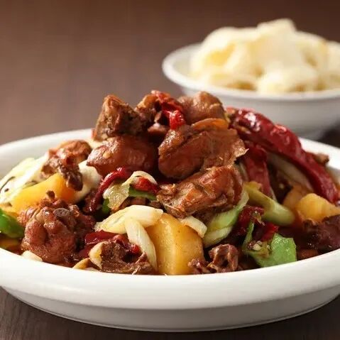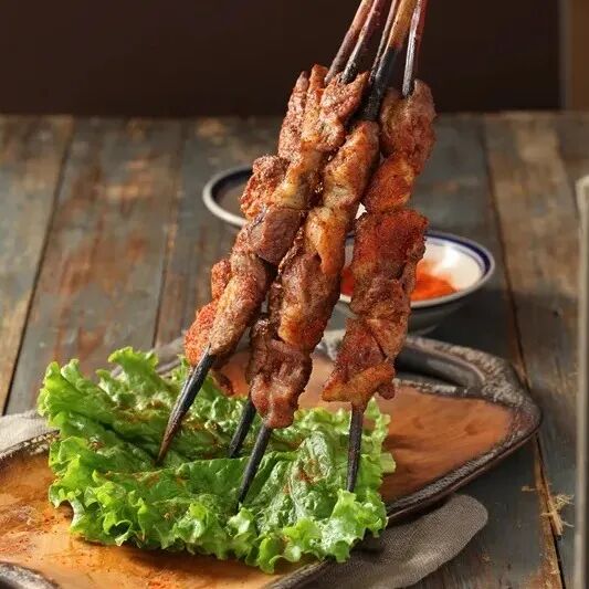 这里藏着新疆人记忆中的老味道,「独创秘方烤羊排」「烤包子」「大盘鸡」等是必点菜。「戈壁红柳烤肉」更是许多人的必点清单,柳木香串着现切羊肉,烤得外焦里嫩,孜然味飘出三条街。