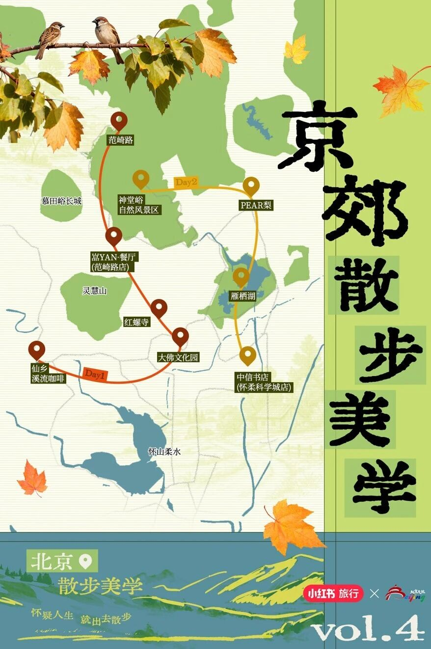 Day2:从红螺寺开始,黄栌映衬红墙,钟声回荡禅意,远山层林尽染,大佛文化园才是红螺寺的最佳秘境,树林中的牌楼仙气十足。接着可以去范崎路逛逛,有装修漂亮的小店、复古红色小汽车、爬墙的大猫,最后可以去仙乡溪流咖啡坐坐,可以踩水、钓鱼、露营,看过《地球超新鲜》的人一定懂。