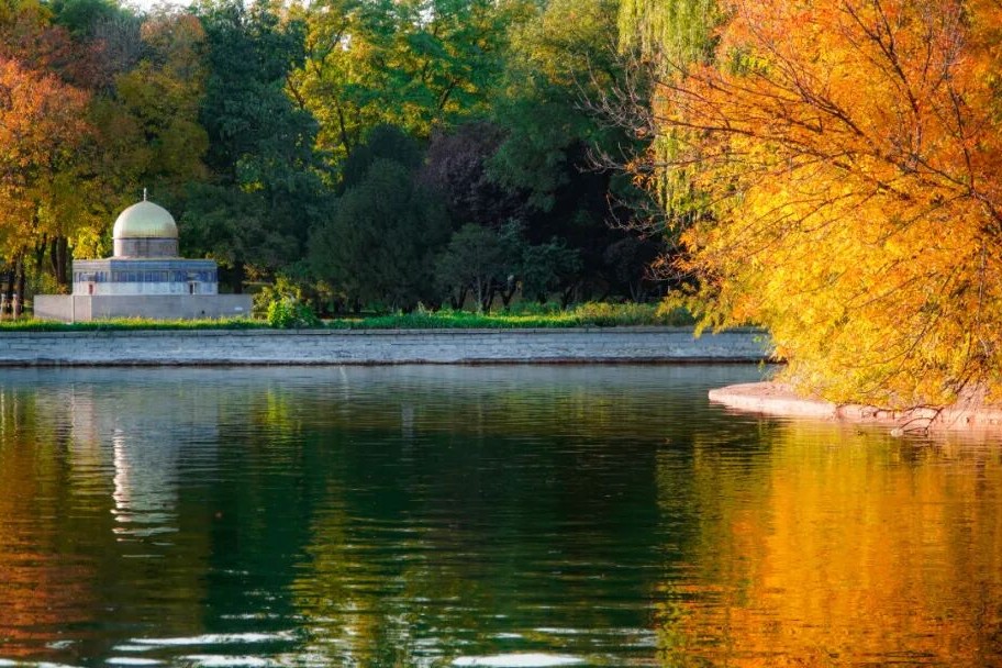秋叶与“各国建筑”相映成趣