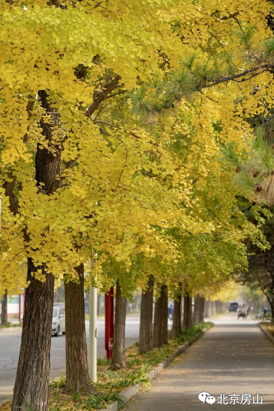 道路两旁的银杏树染成金黄