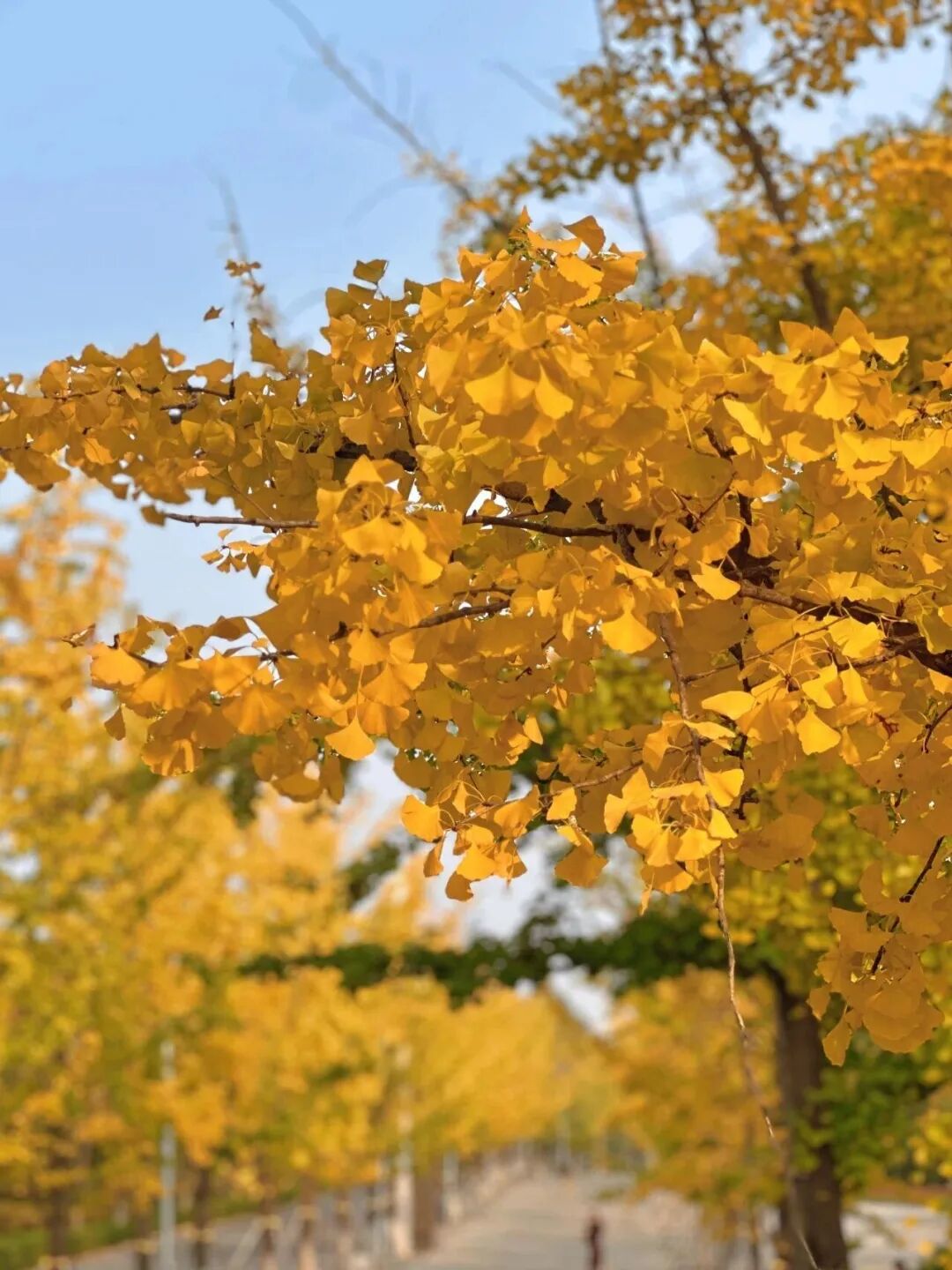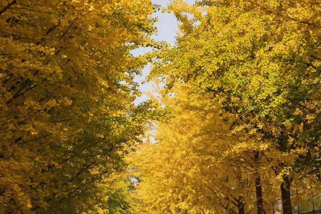 银杏枝叶在头顶交织成拱廊