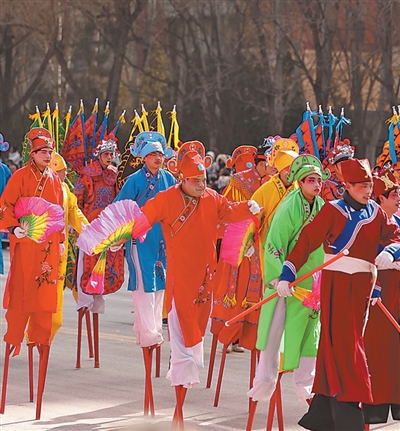 在山西省晋中市榆次区举行的高跷表演现场。