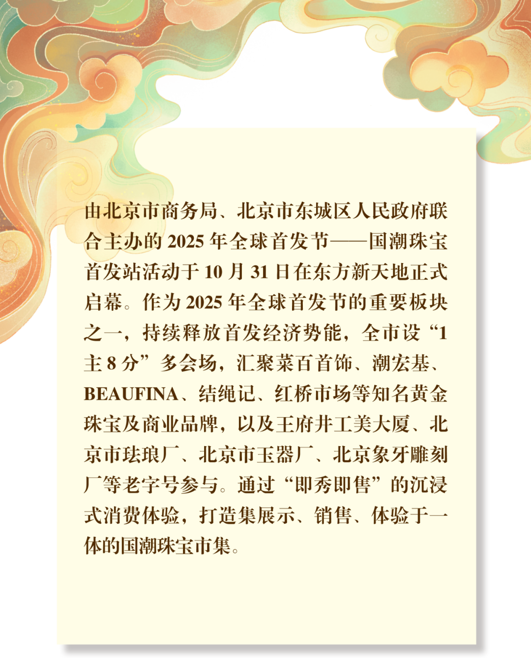 此外,主会场还将联动东方新天地各类国潮珠宝首饰品牌,汇聚老铺黄金、周大福、中国黄金、六福珠宝、周生生、老凤祥、谢瑞麟等众多品牌,实现珠宝品牌一站式轻松逛购。本次活动通过场景化布局、互动式体验,多品牌联动为消费者构建全方位、多感官的国潮珠宝消费新体验。