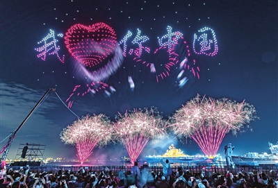 节日的夜空,因科技与艺术的极致交融而沸腾。“津彩盛焰·礼赞祖国”大型沉浸式无人机焰火秀,以铁甲航母为独一无二的背景,上演了一场超越想象边界的视听史诗。千架无人机如同被精密编程的萤火虫军团,以天为幕,以光为笔,在夜空中复现出航母编队的巍峨轮廓,以硬核科技写下对伟大时代的深情礼赞。旋即,传统焰火表演轮番献彩,“七彩祥云”如梦似幻,“金色麦浪”涌动丰收的喜悦,“紫霞云瀑”倾泻而下的浪漫……一幕幕绚丽场景,将磅礴的家国情怀与温馨的节日浪漫熔于一炉,让每一束光影都成为游客心中难以忘怀的记忆。