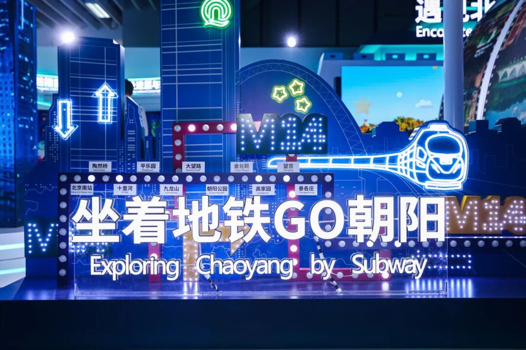 通过“地铁14号线”站名牌与三道弧形柔性LED屏并列布局,构建出一个象征城市商业活力的艺术空间。国贸CBD、三里屯、SKP等地的繁华景象在屏上流转,形成一条视觉化的商业动脉。观众穿行其间,即可亲身感受朝阳区强劲的经济脉搏与时尚律动。