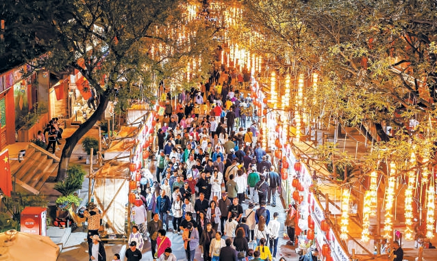 曾经一家饭店也没有的主街上,如今已经汇聚了八方美味。老北京的“馄饨侯”,连锁餐饮“南城香”,混搭了齐齐哈尔和贵州风味的“鸿雲楼”,快餐“万国福地火烧夹”,市井港味的“阿姐炭炉牛杂煲”……
