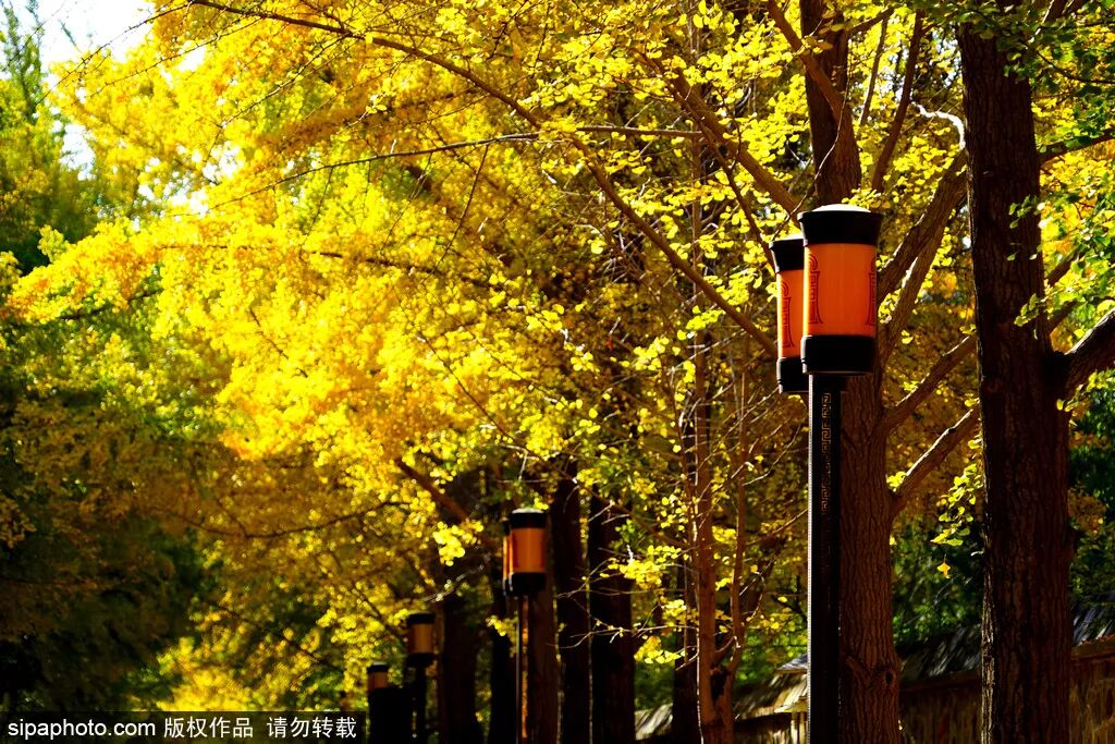 在圆明园三园交界至西洋楼遗址西口,有一条近千米长的银杏大道,景色已经达到鼎盛,满眼的金黄色,让秋天变得靓丽,让漫步的游人不禁驻足欣赏。