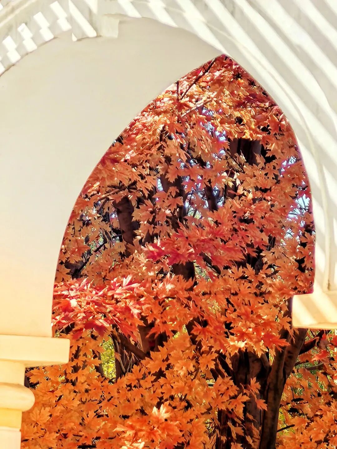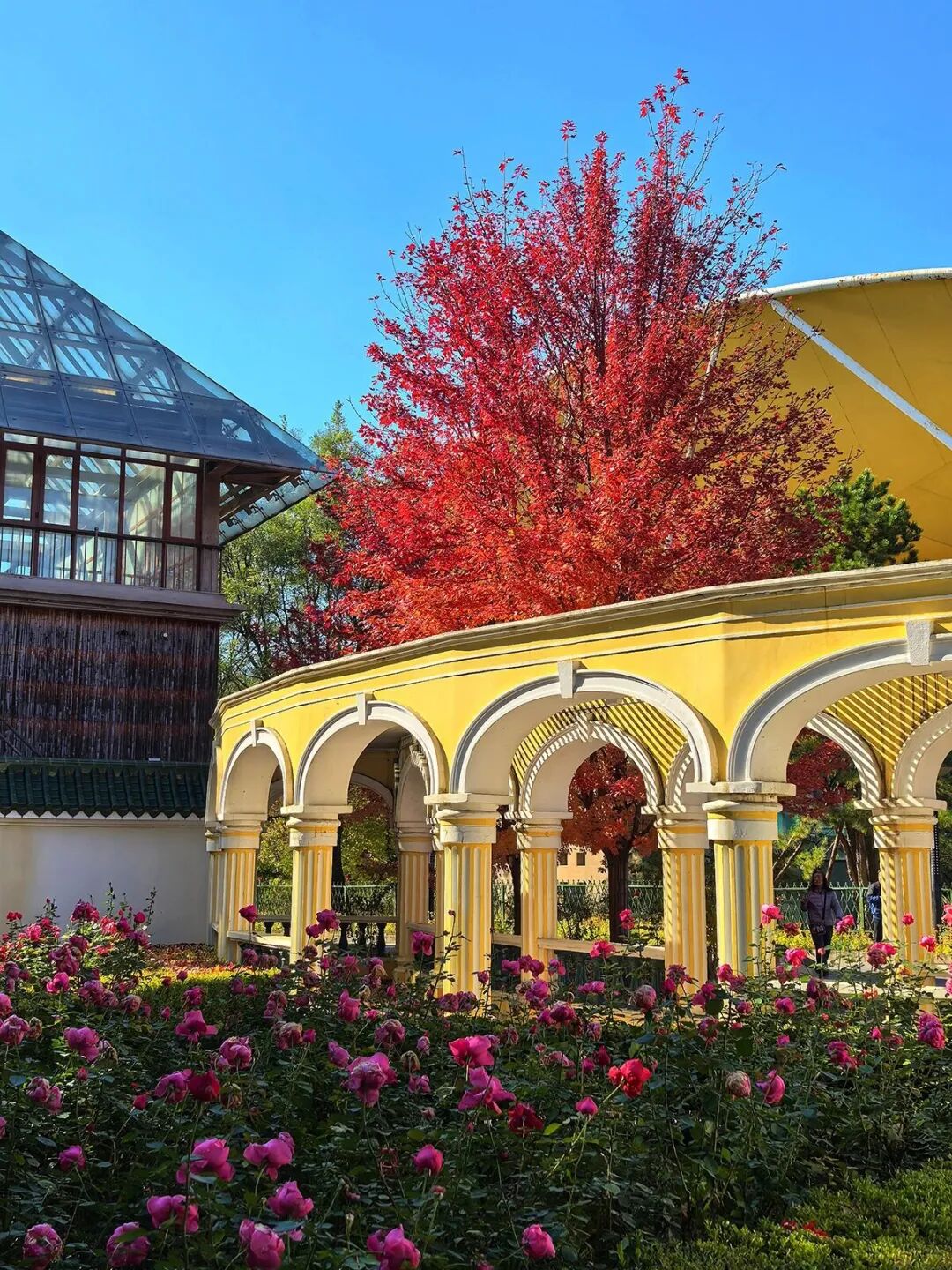 澳门园里,满目枫红衬着特色景致,随手拍都是质感大片。