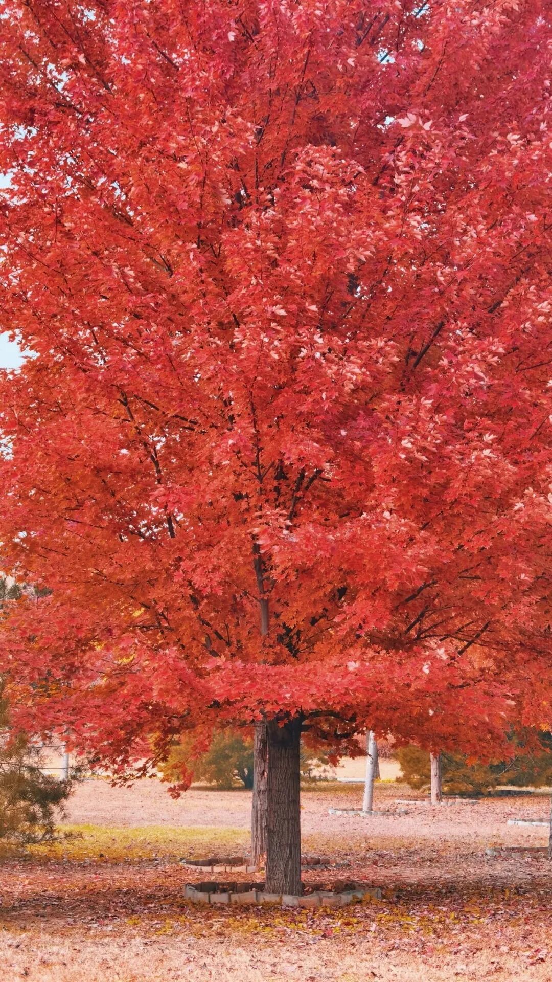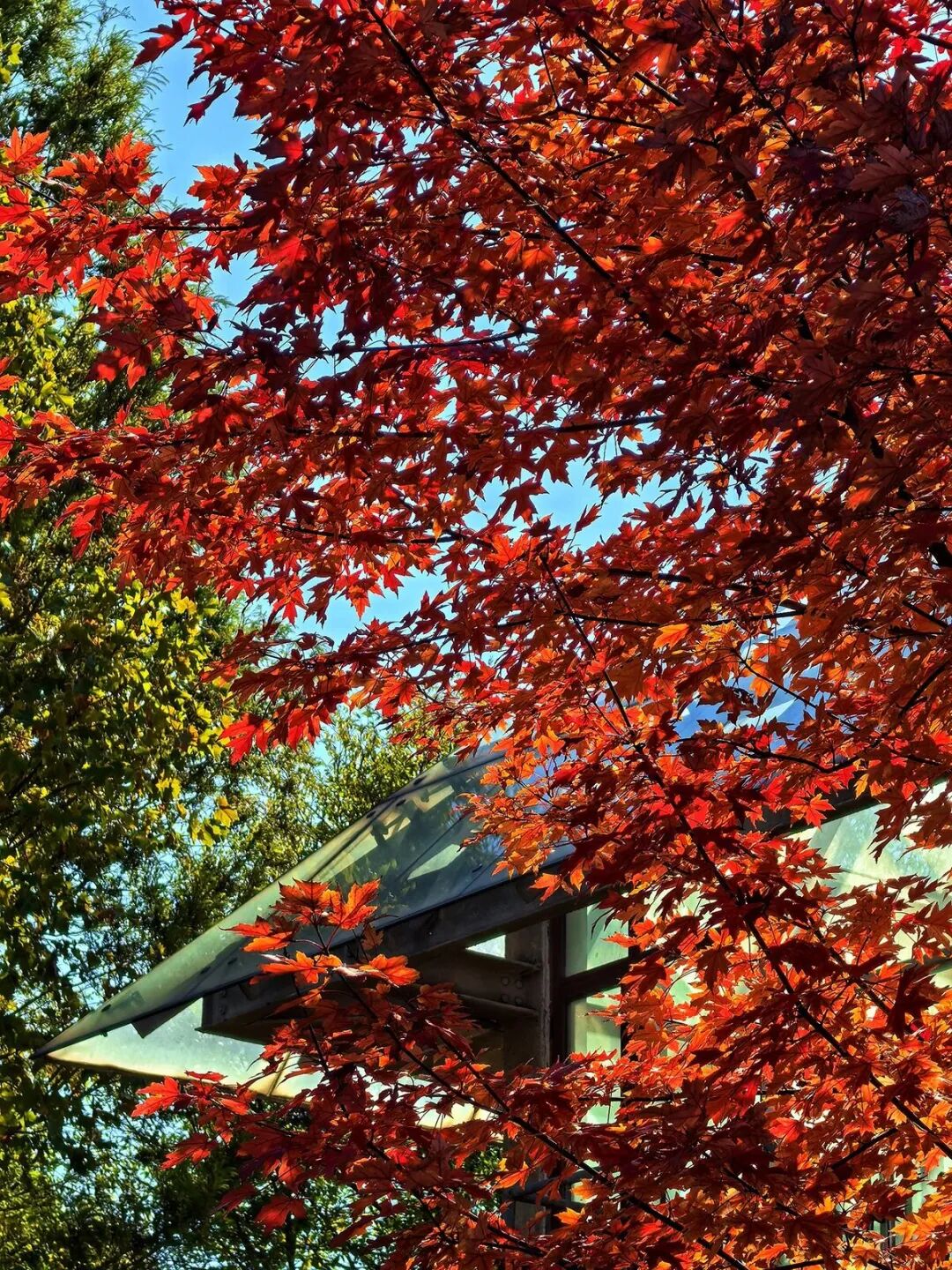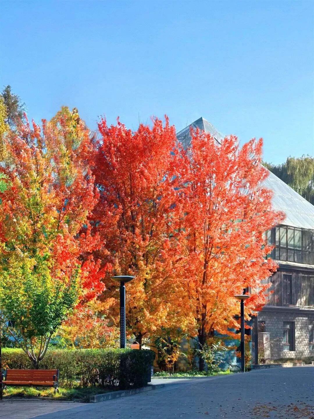 10月下旬至11月中旬是银红槭的最佳观赏期,原本青绿的叶片被秋意浸染,逐渐转为橙红、绯红,直至整棵树被深红色包裹。