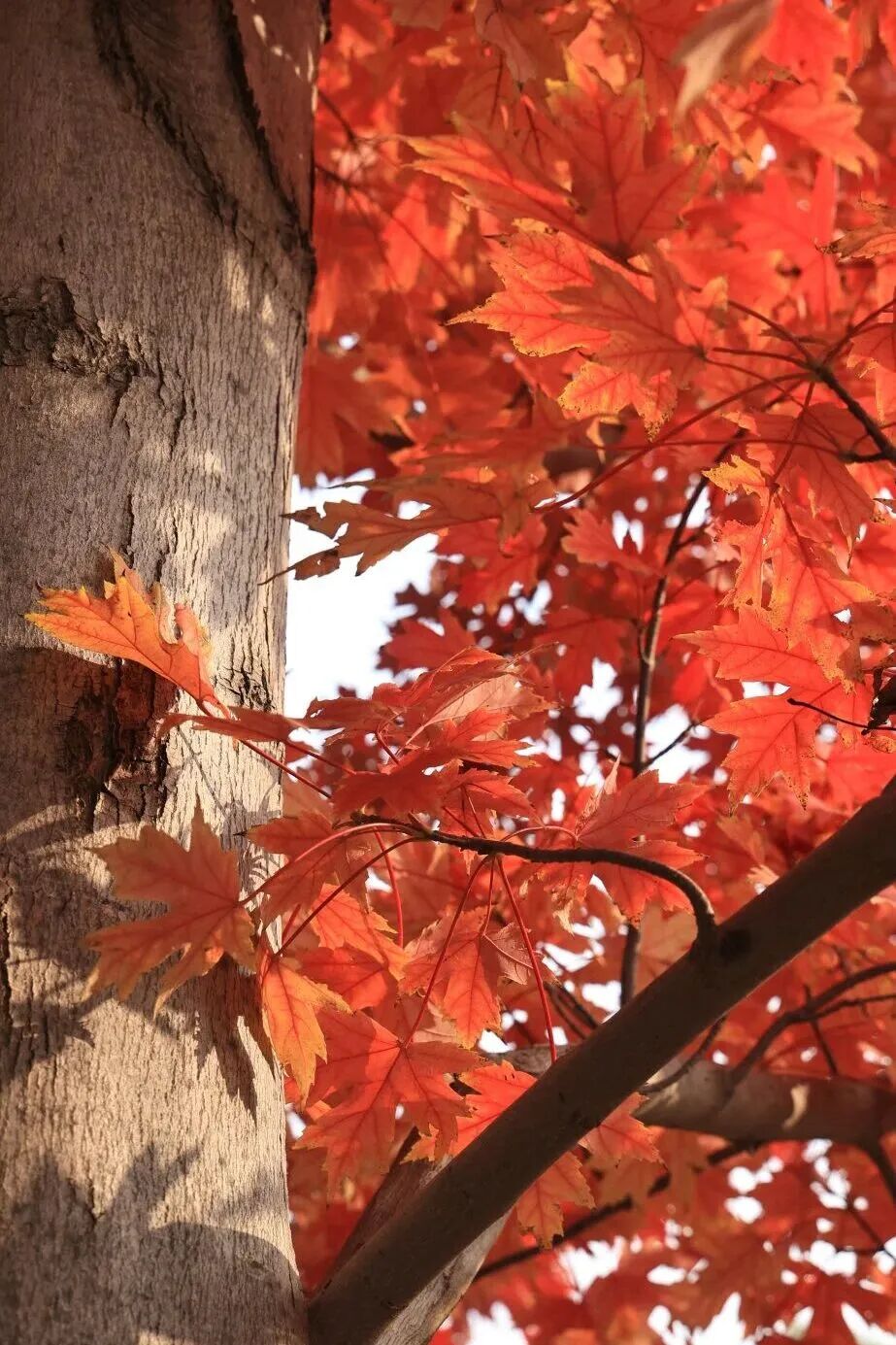 天气正好时,阳光穿过枝叶,叶片在光影间明暗流转整棵树宛如披上了一袭会呼吸的锦缎,秋风轻拂,红叶摇晃,像流霞翩跹又似红绸轻舞。