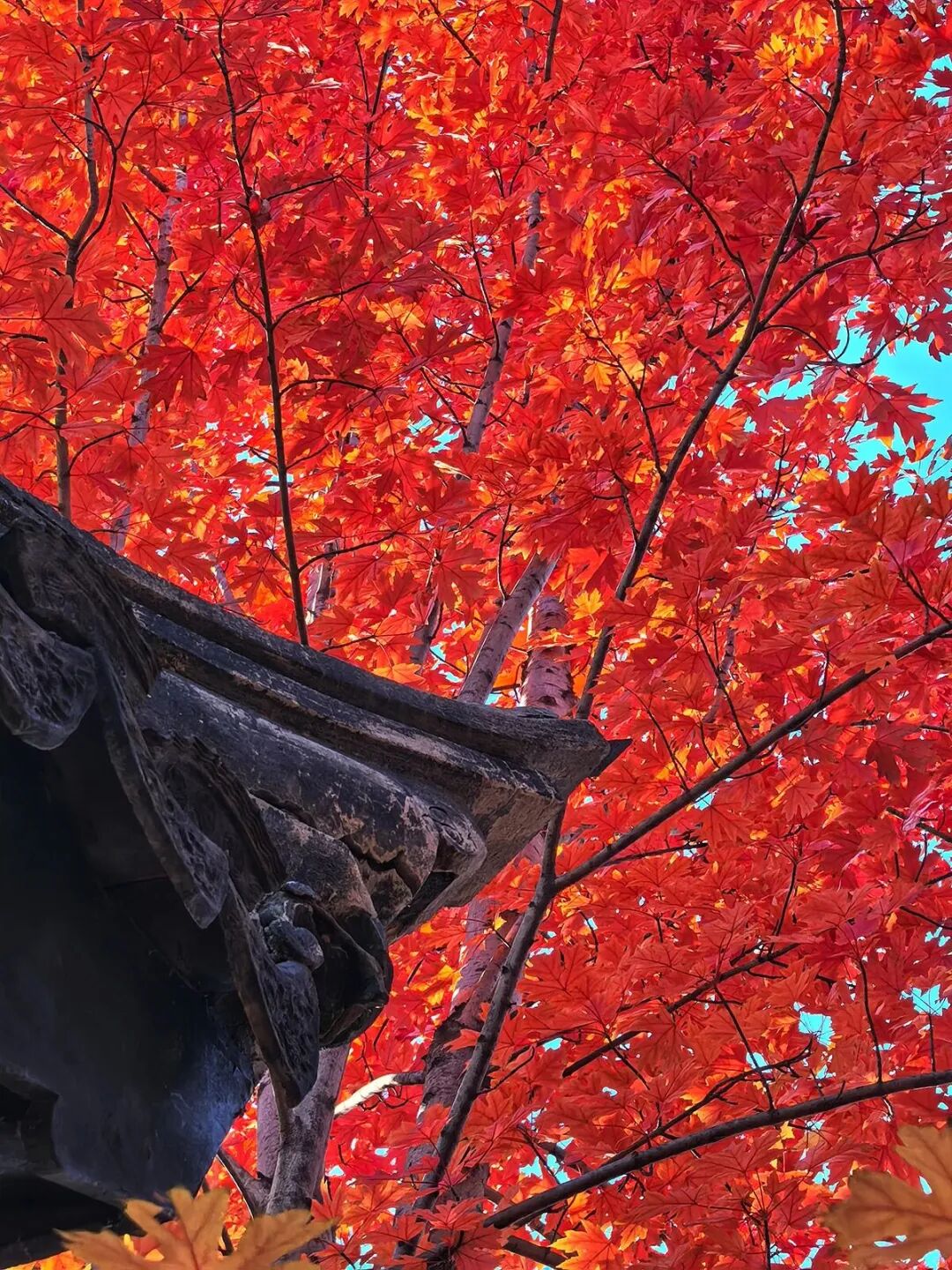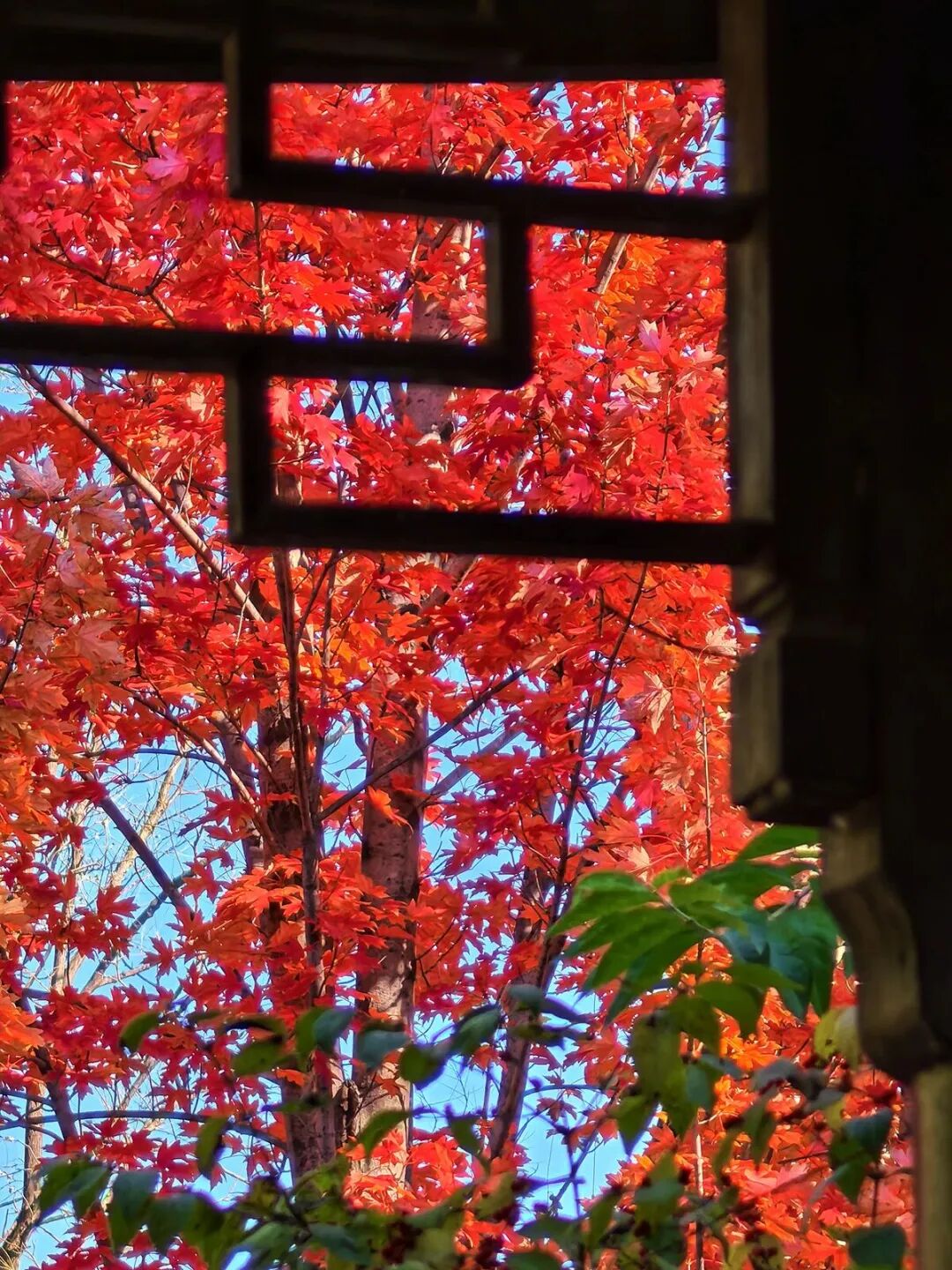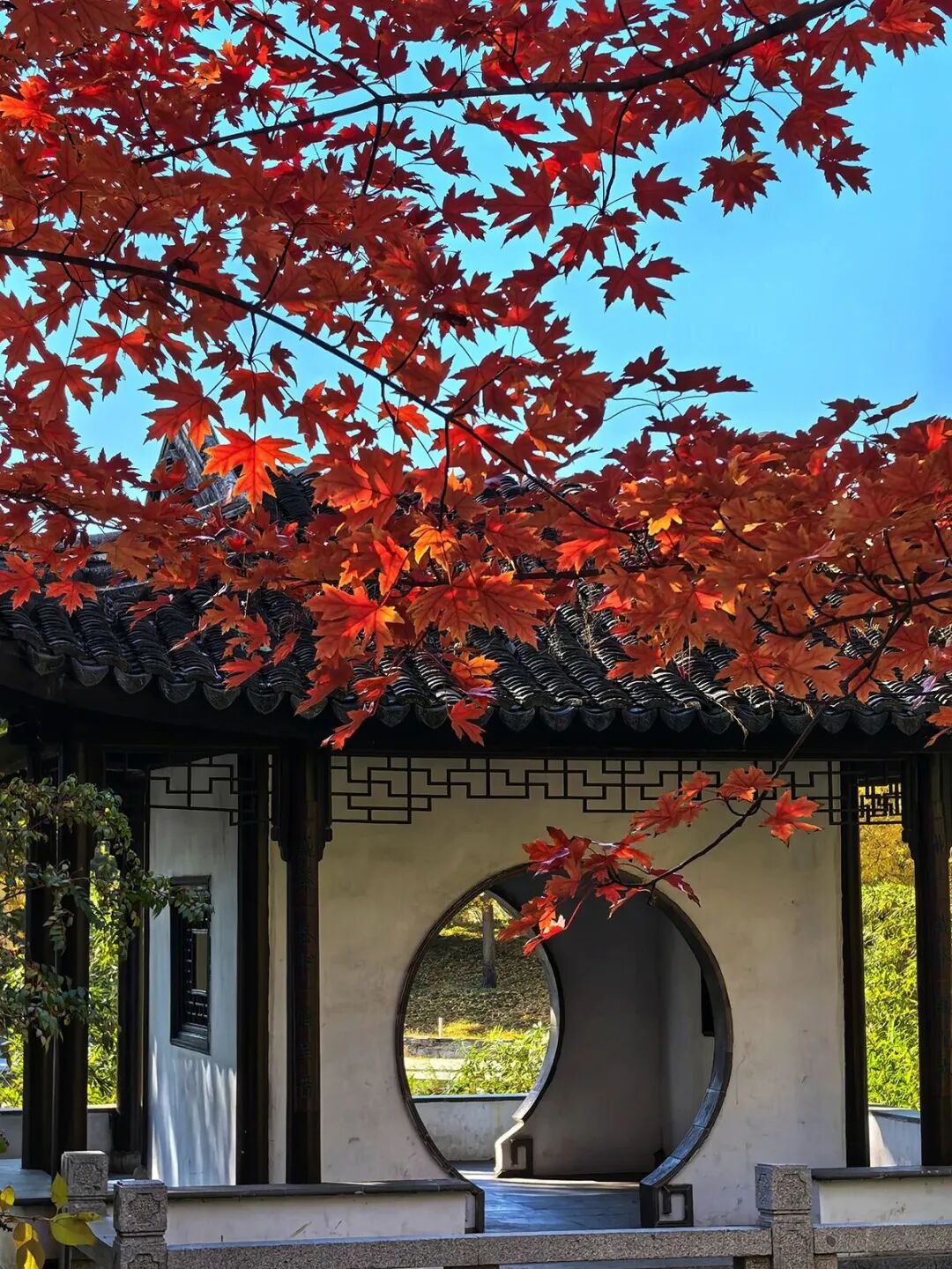 江苏园里枫红映古建,黛瓦红枫相映成趣,古风氛围感拉满。