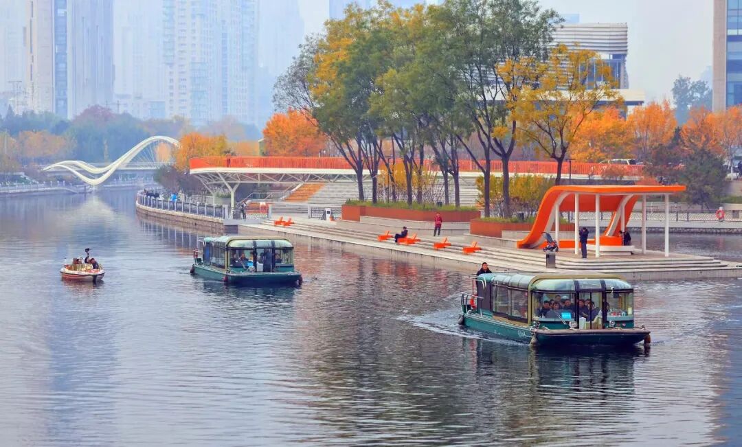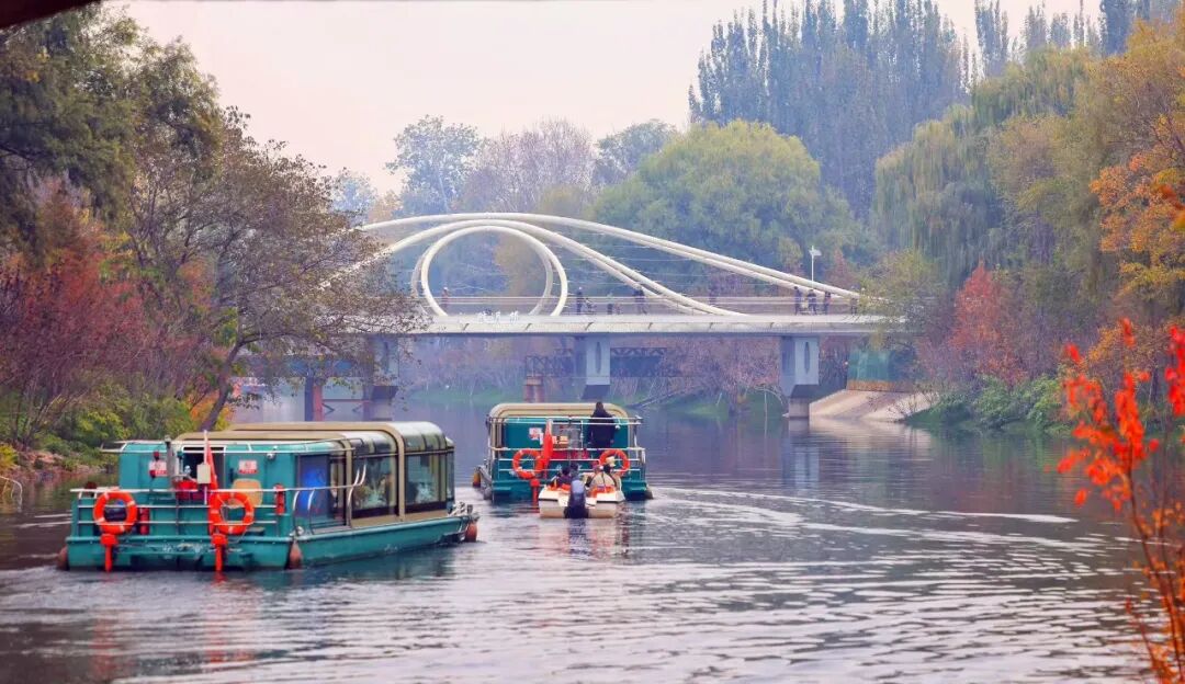 航线藏着“四季有景”的匠心,每一段都美到犯规!春日山桃、碧桃漫坡绽放,粉白花朵如云似雾,河面倒映着繁花,像闯进粉色梦境。秋日皓月桥边金叶水蜡层林尽染,橙红水杉倒映水中,宛如莫奈笔下的绚烂油画,随手拍都是大片。全年更有二月兰、波斯菊次第开放,河岸始终有繁花点缀,四季皆景,随手一拍就是大片!