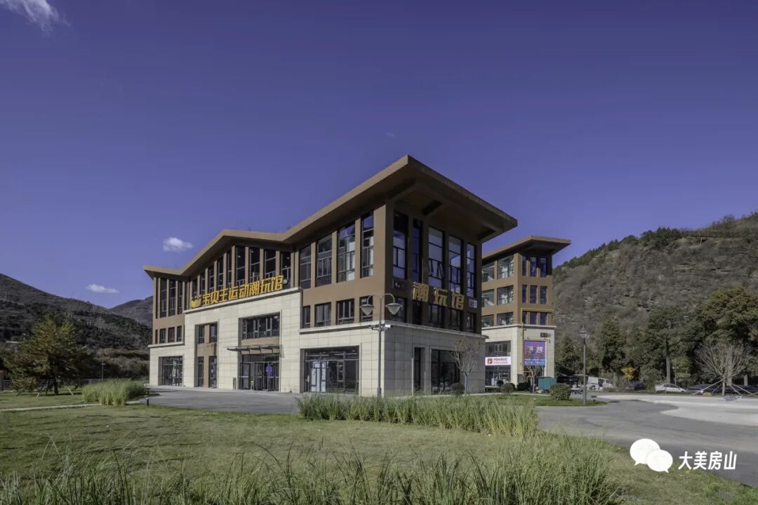 酒店坐落于佛子庄乡大石河畔,距京昆高速出口30分钟、北京市中心60分钟车程,交通便捷却藏着避世静谧。18栋建筑依山而建,推窗就是漫山绿意,晨起听鸟鸣、入夜观繁星,让都市人瞬间逃离喧嚣。