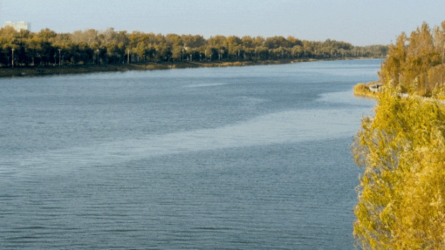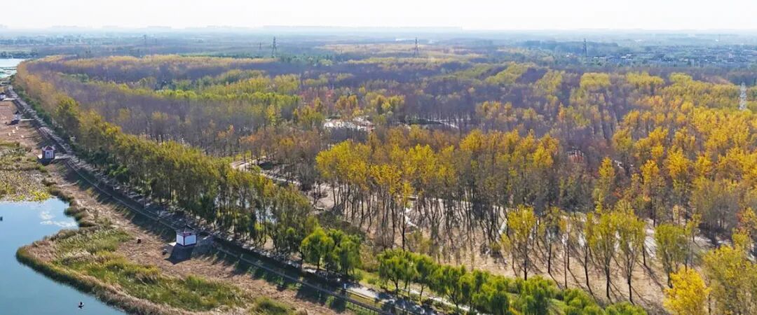 沿着潮白河畔漫步,公园展现出一幅水林相映的长卷,天高云淡,金色树影倒映在澄澈水面上,虚实交错,意境悠远。