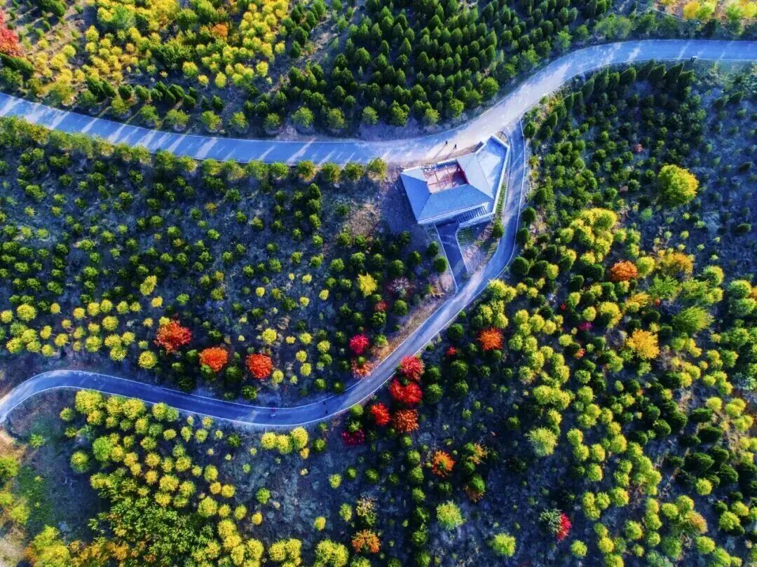 这里草木繁盛、野趣十足,道路随丘陵地势高低起伏,慢跑道蜿蜒着伸向远方。登高远眺,可见不同树种的秋色交错分布,形成丰富的色彩层次。