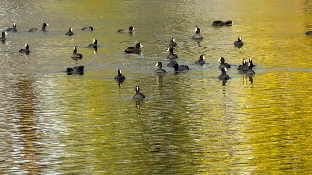 骨顶鸡是游泳高手,时常在水面上划出一道道优美的水线,而更为羞涩的黑水鸡,身披黑褐色羽毛,额甲像一颗红宝石镶嵌在头顶,嘴尖那抹明黄,在秋日阳光下格外醒目。
