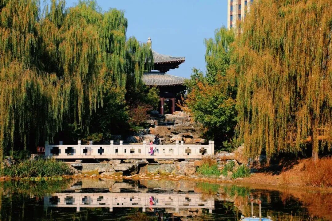 漫步于园中,走过三孔桥,可见假山叠水与秋日彩叶相映成趣,金色的落叶与古朴的桥涵,共同构成一幅诗意的画卷。