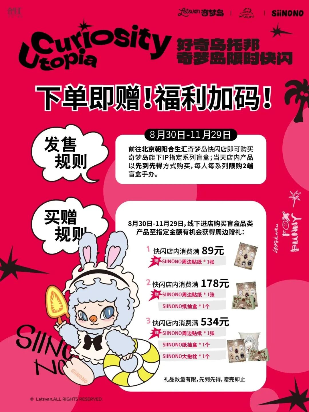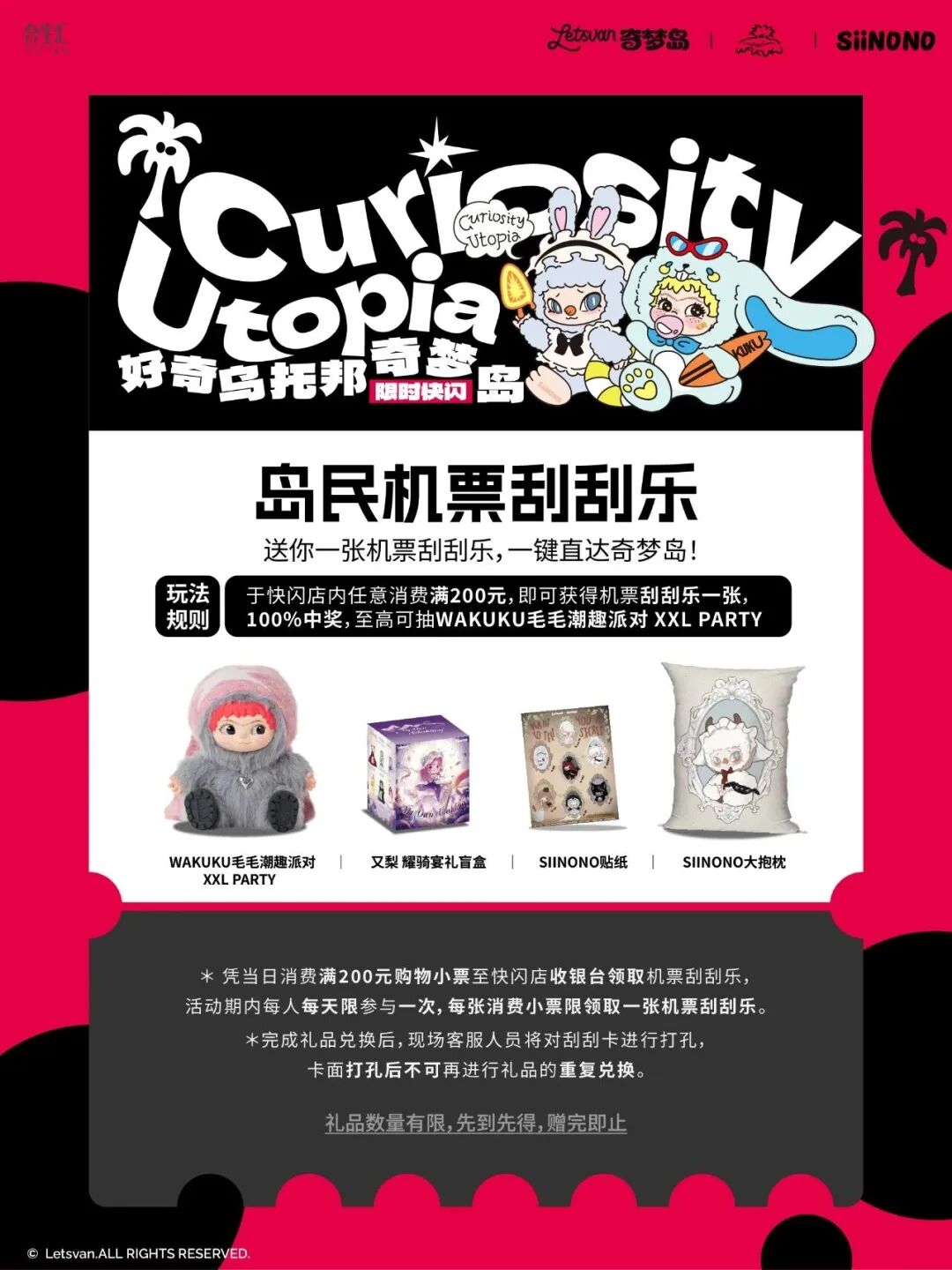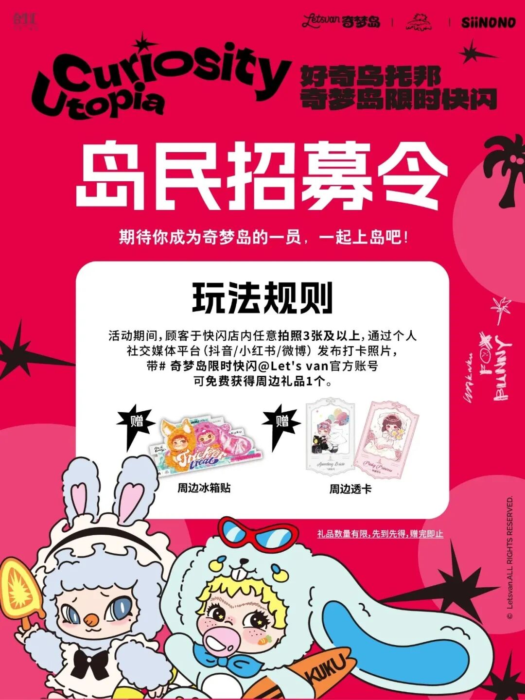 冰箱贴、透卡免费赢,消费满赠刮刮乐,下单即赠周边礼物,现场更有打卡等多重岛民专属惊喜活动,等你来参与!