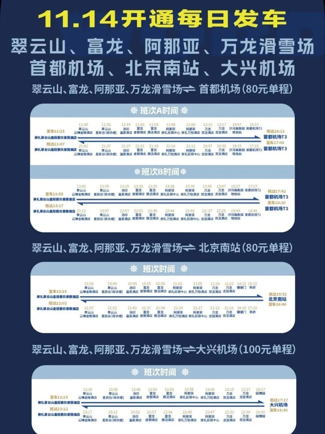 北京至张家口崇礼冰雪直通车14日首发。据悉,从北京出发,冰雪直通车分为崇礼城区、冬奥核心区两大发车方向:城区方向涵盖万龙度假天堂、阿那亚・崇礼、富龙四季小镇、翠云山银河度假区4家滑雪场;核心区方向串联云顶密苑、太舞滑雪小镇、雪如意滑雪场3家冬奥场馆。