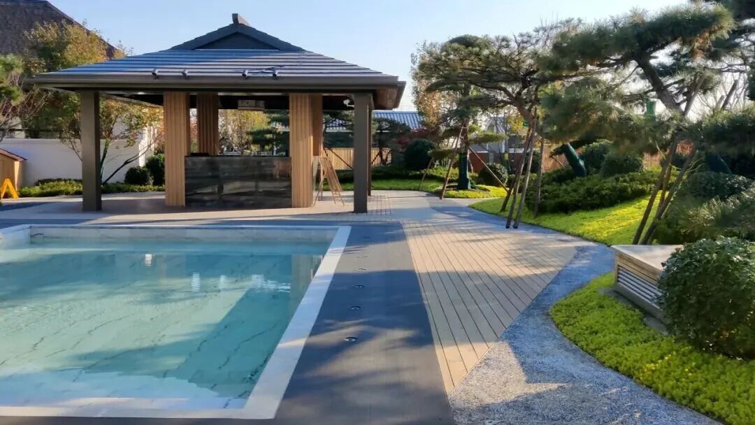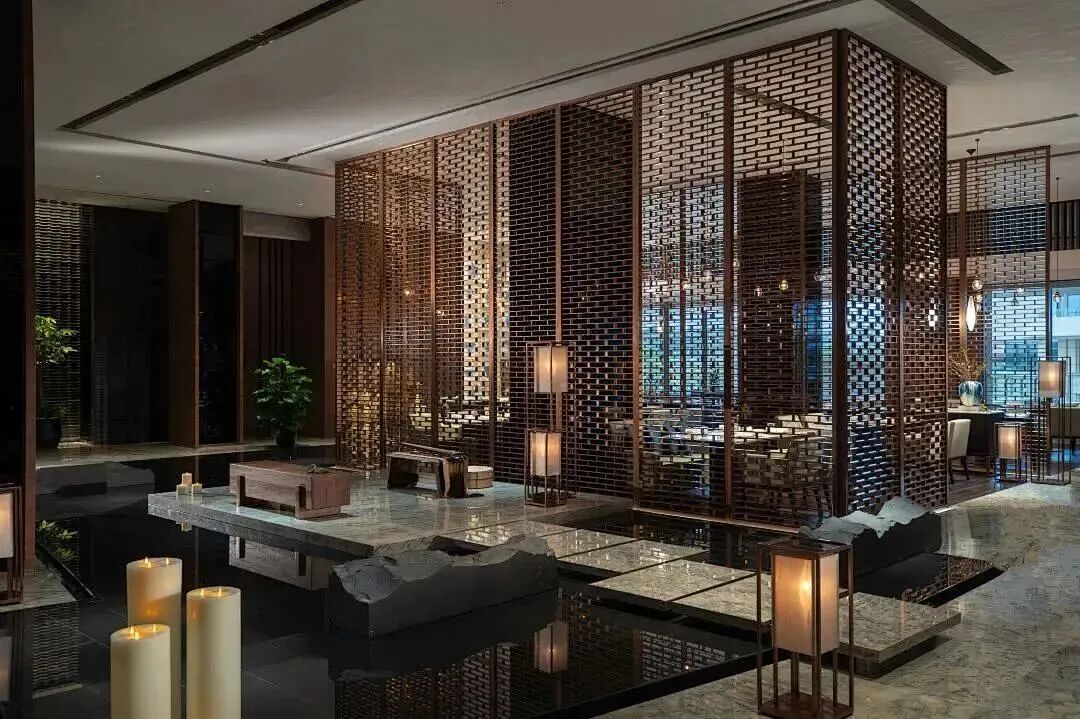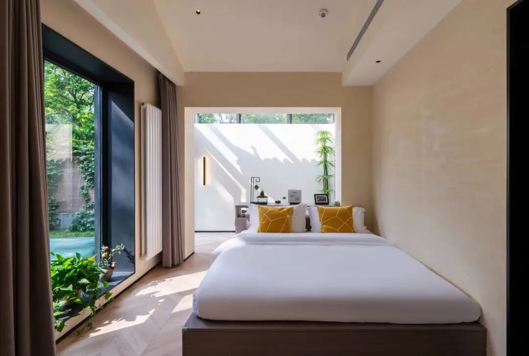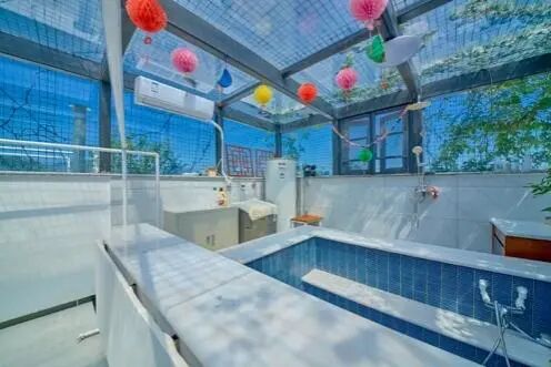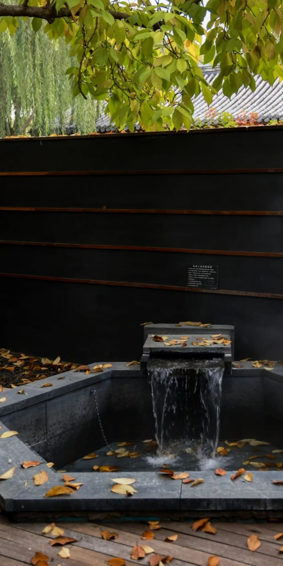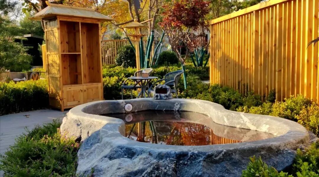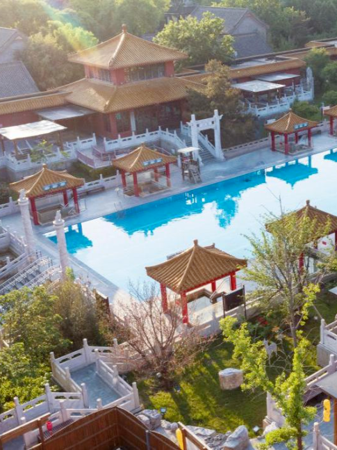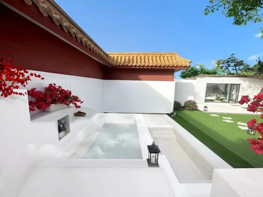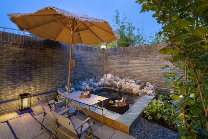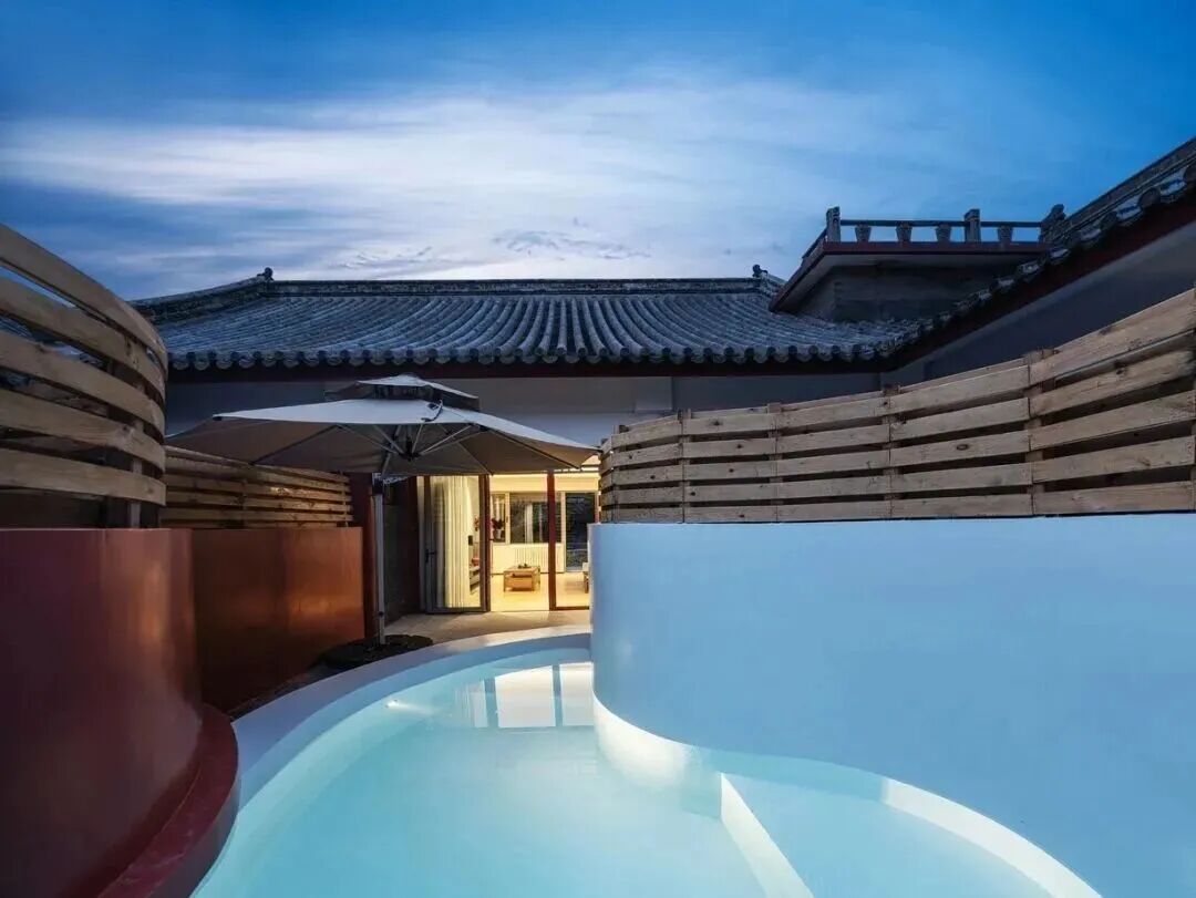 酒店整体建筑为三进院落的中式庭院,青砖灰瓦、苍松翠柏、流水潺潺,一步一景,移步换景,庭院中设有不同造型的露天泡池,如圆形、方形、葫芦形等,与自然景观相融合,形成“曲水流影,私汤氤氲”的诗意空间。