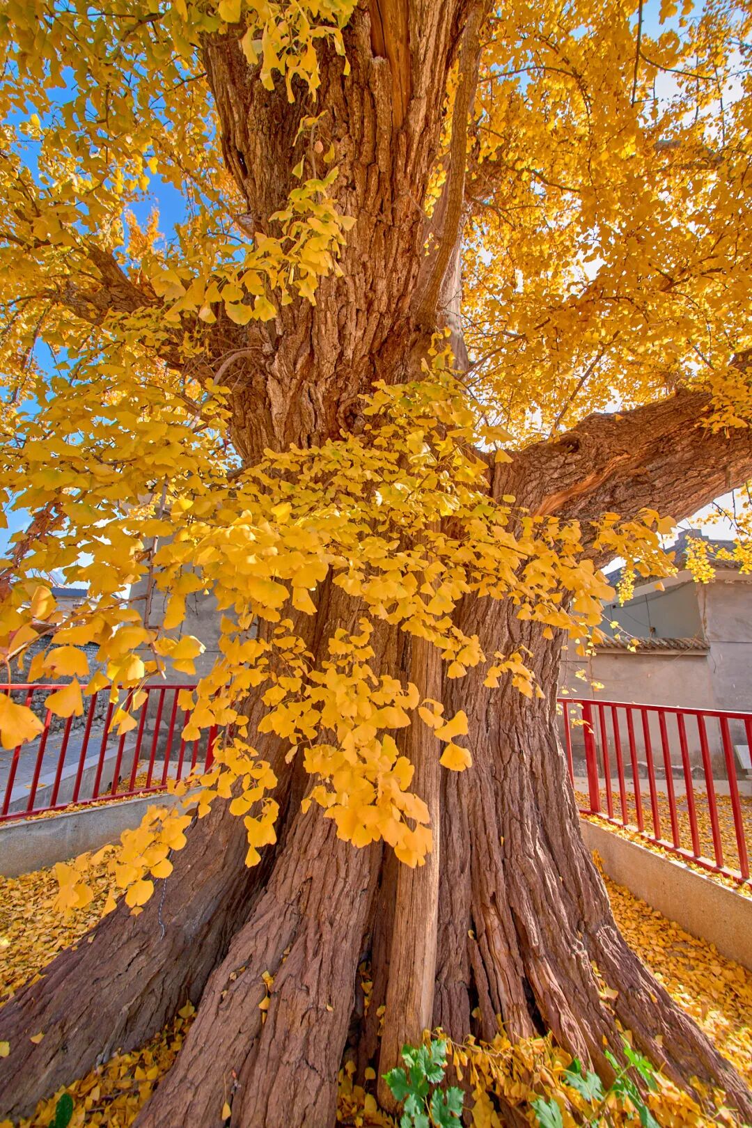 最后来到长城脚下的居庸关村,打卡1200年的“关沟大神木”,这棵唐代古银杏冠幅超广,像一把撑开的巨伞守护着古关道,抬头是满树金黄璀璨,远眺是层林尽染的秋山,当微风拂过,叶片沙沙作响,仿佛在诉说着关沟古战场的千年故事。
