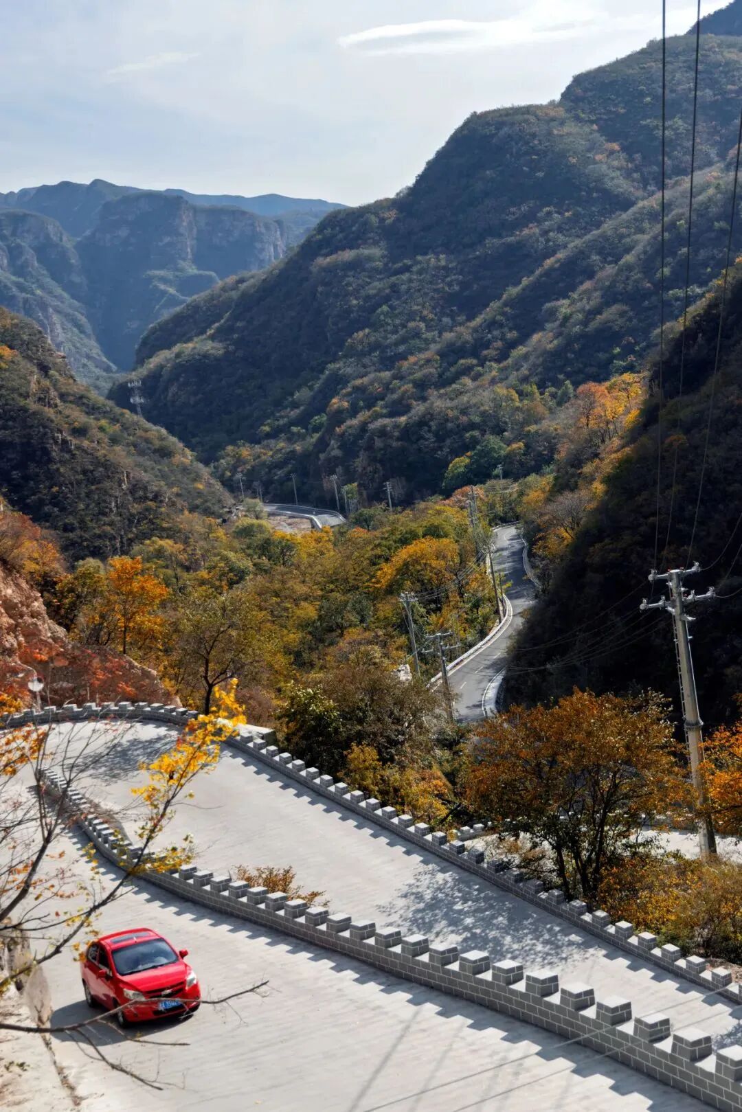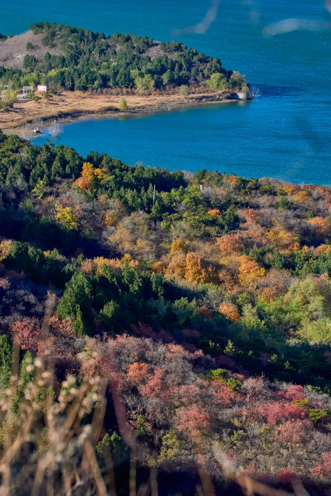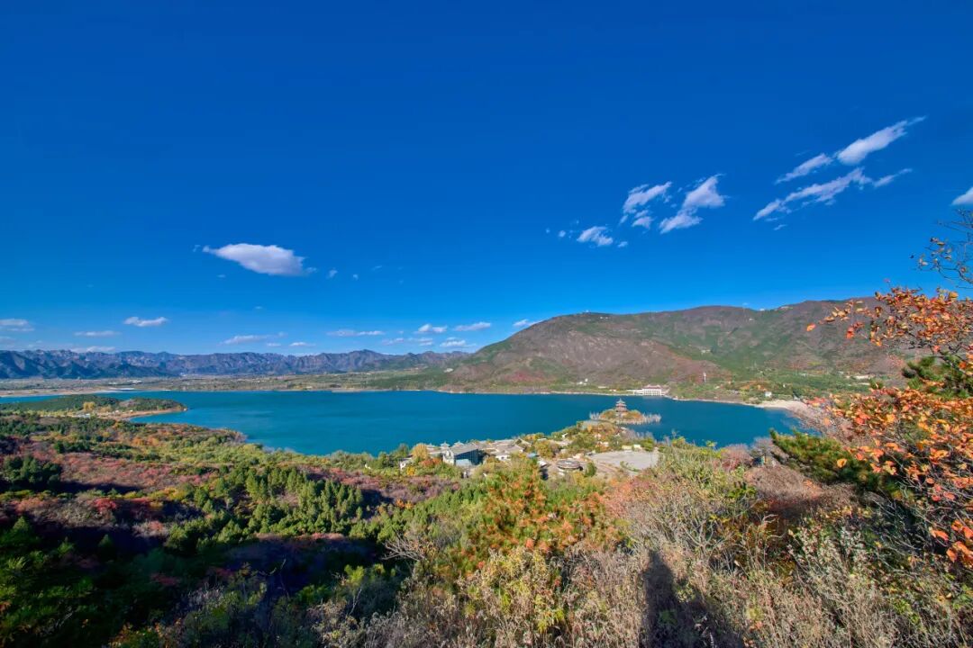 驱车前往汉包山的沿途,色彩从浅橙渐变为火红,宛如大自然打翻的调色盘,沿登山步道上行,站在观景亭处眺望,十三陵水库的碧波在阳光下泛着金波。