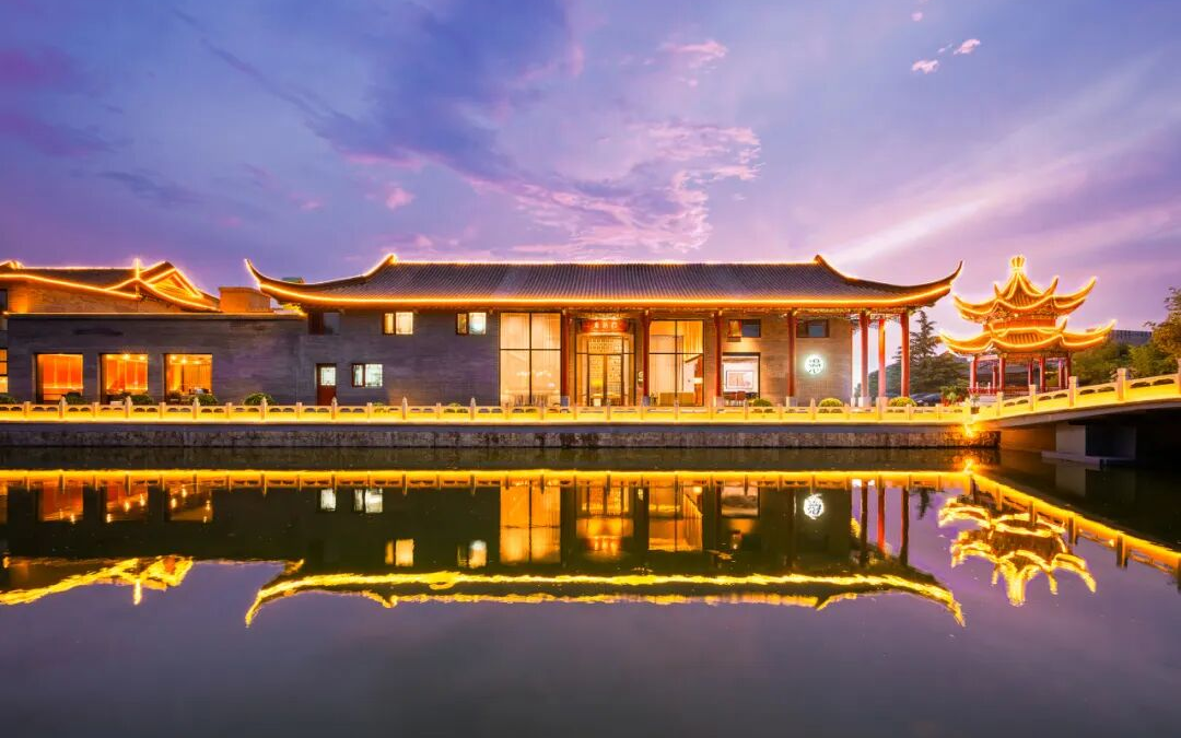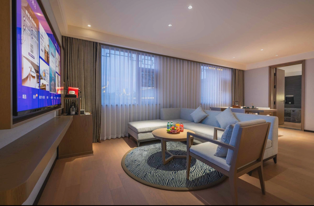 酒店隐于秀水湖公园的湖心岛上,曾为新版红楼梦选秀基地,故又名红楼岛,这里以苏式园林为骨,融入北京四合院气韵,飞檐翘角含江南婉约,青砖灰瓦显北方沉稳,亭台水榭错落,推窗即见湖光涟漪,重现“不出城郭得山水之怡”的诗意。