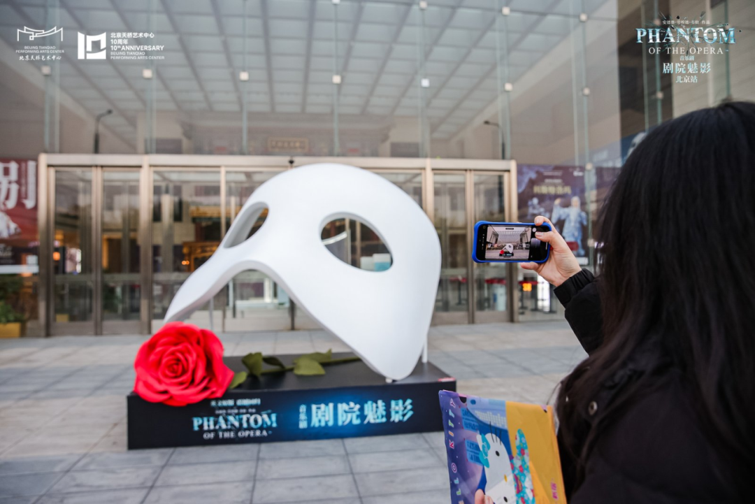 北京天桥艺术中心剧场门前已布置了高达三米的“魅影面具”装置,它迎接着每一位观众的到来,成为大家记录美好观“影”瞬间的,最有仪式感的标志。