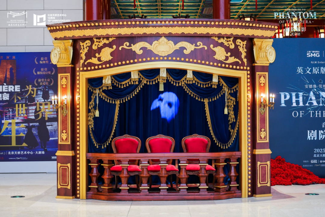 步入剧场便能看见中区的魅影装置啦,展板上标志性面具与玫瑰花图案,环绕着流光灯带,右区卡司墙以纪念票根为造型,还有剧中五号包厢场景,邀你入戏体验魅影视角。
