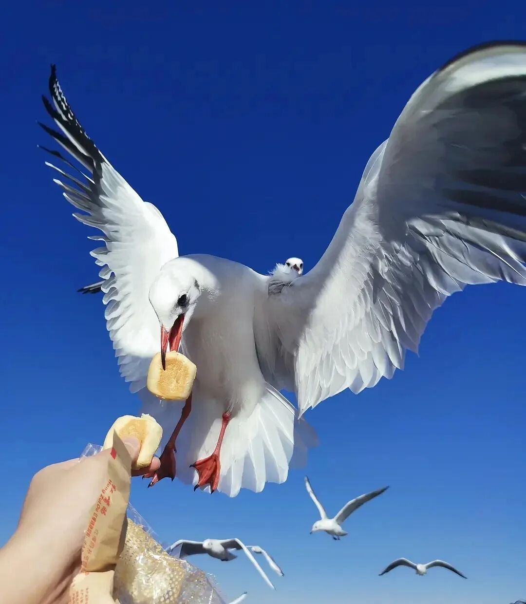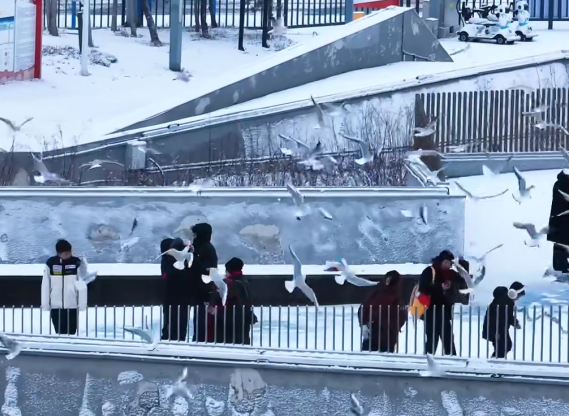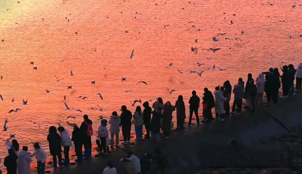 观海平台上,众多游客手持面包碎屑轻抛空中,海鸥精准俯冲叼食,清脆鸣叫与欢声笑语交织成趣。