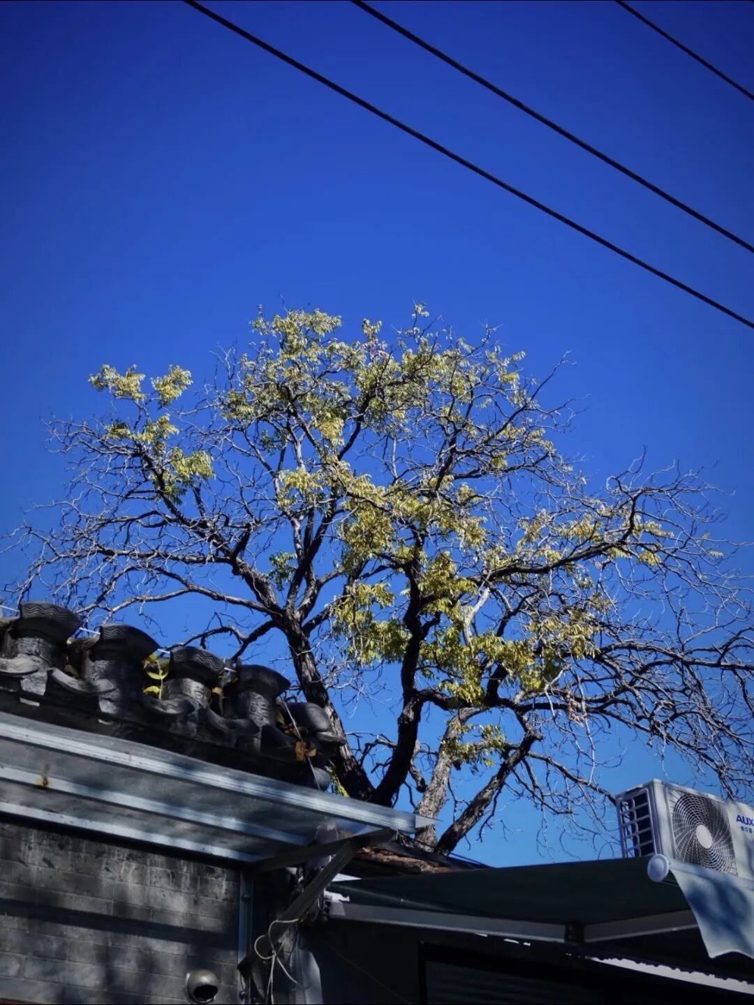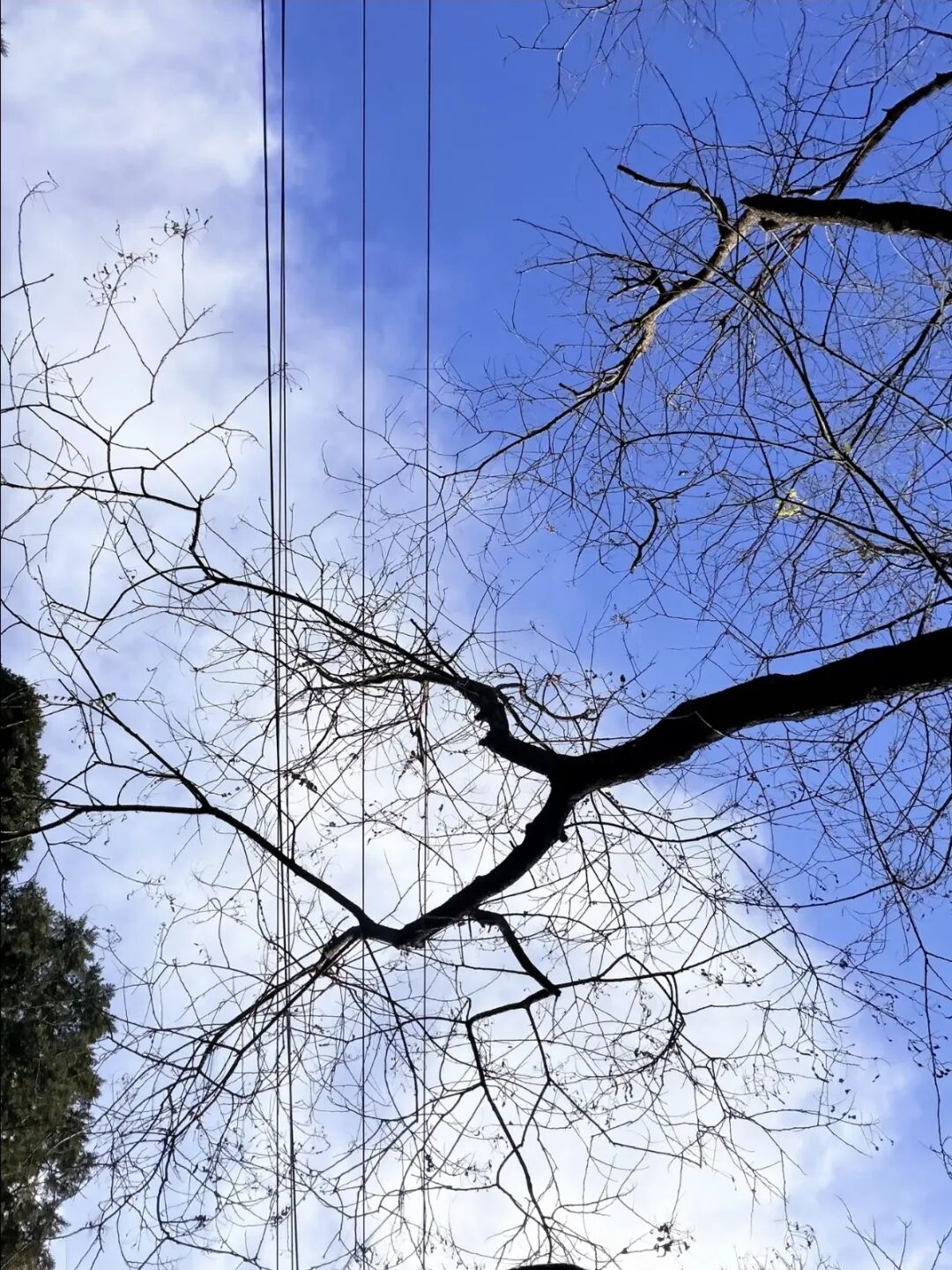 看枯枝与白墙灰瓦交织,看电线与树枝勾勒的几何画,晴朗的日子里蓝天澄澈如洗,阳光透过枝桠洒下,连影子都变得温柔。