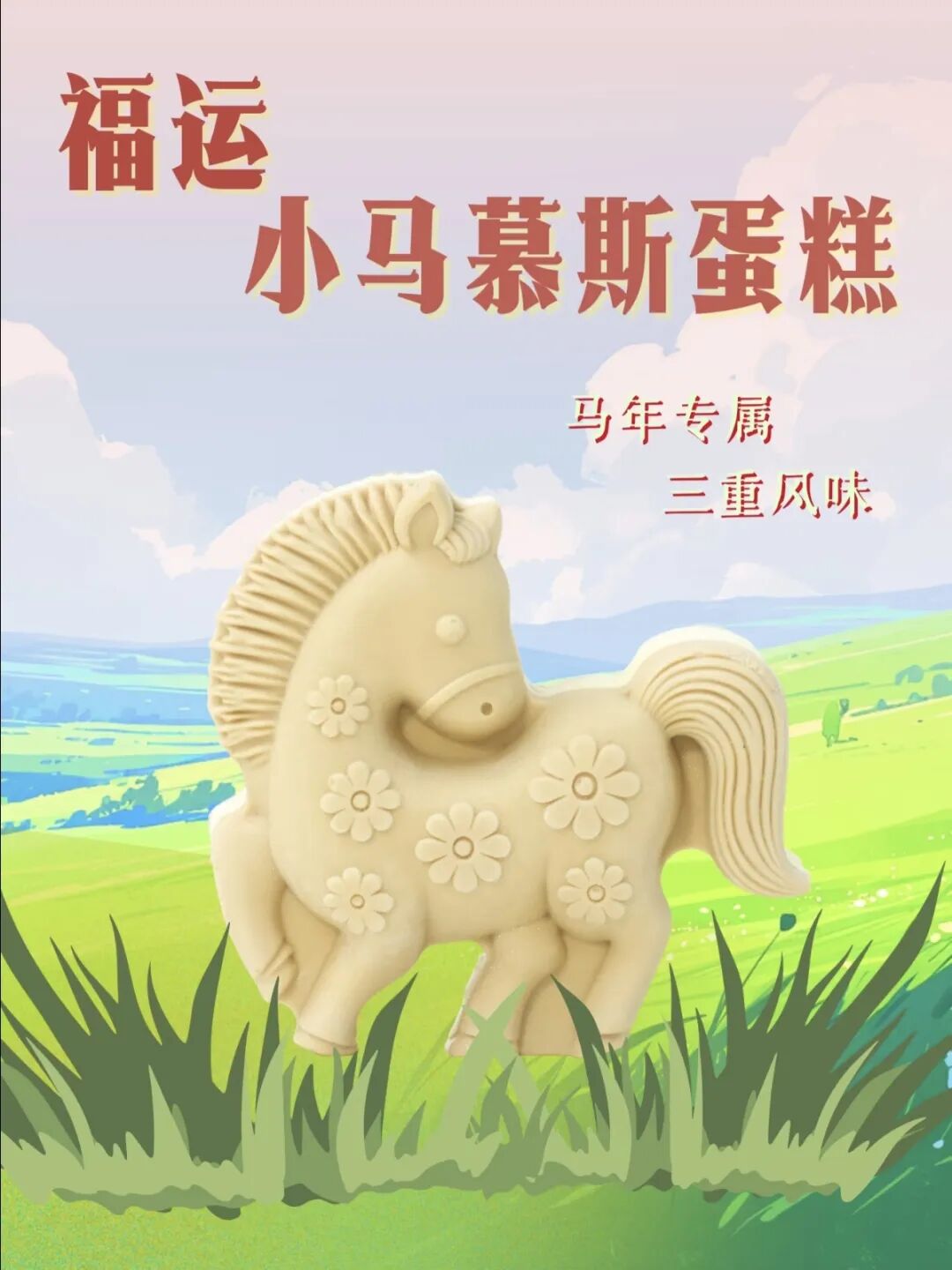 福运红丝绒蛋糕卷,特调夹心融奶酪浓香与柠檬清甜,福运小马慕斯蛋糕,马年专属,萌趣吸睛,糯香黄豆面大福,奶油红豆馅加上黄豆粉点缀……