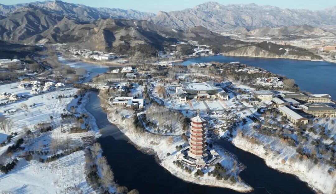 雁栖湖位于北京郊区怀柔城北8公里处的燕山脚下,是以湖面为中心的水陆区域,风光旖旎,湖水清澈。每年春秋两季常有成群的大雁来湖中栖息,故而得名。雪后的度假区,万物覆白,四下静然。飞絮翩跹,缓缓而落;层林尽染,皑皑无瑕。这幅冬日的山水长卷,是自然时序独有的馈赠。