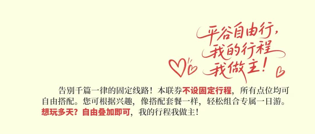 我的行程我做主,搭配专属玩法 本联券打破固定线路束缚,所有点位自由搭配!我们为您精选6条主题线路,涵盖滑雪、采摘、民宿、美食,嵌入实景图片,带您云体验平谷魅力。