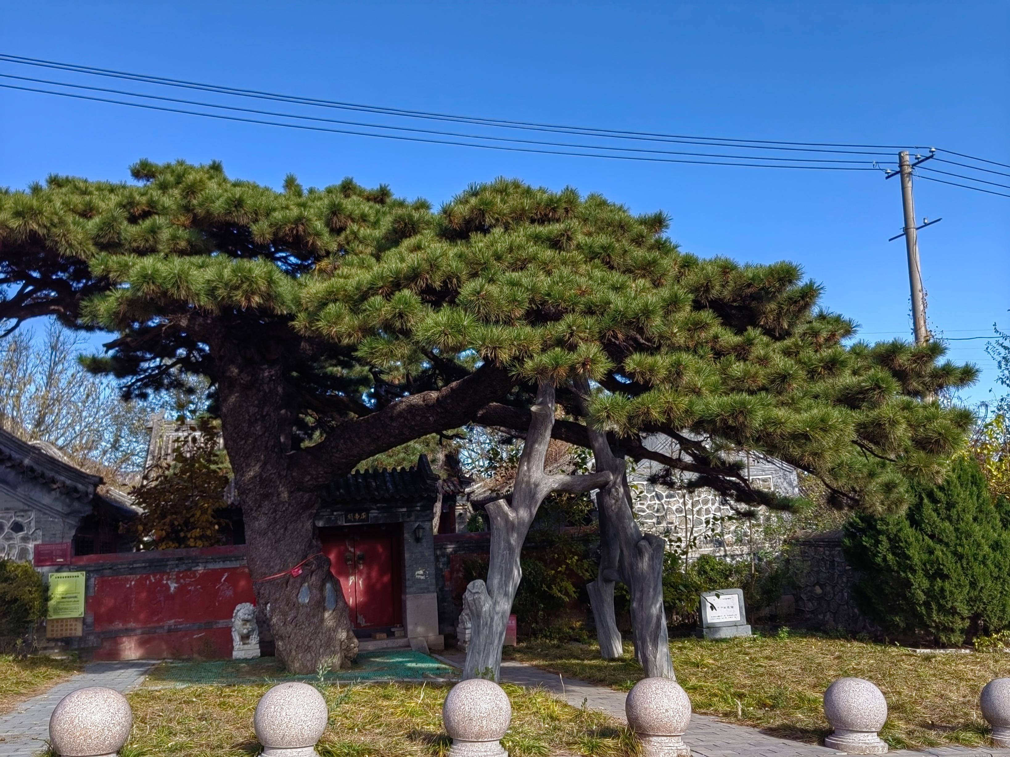 黄山有棵迎客松,京西凤凰岭景区南线的车耳营村也有一棵。这棵苍劲的古松为辽代所植,树龄约一千年,与黄山迎客松的树龄相当。姿态也一样,主枝向村路伸展,宛如热情的主人伸出手臂,迎接四面八方的宾客。不同的是,黄山迎客松倚青狮石破石而生,而车耳营村这棵迎客松长在村口平坦的路边,背后是一座寻常小庙——关帝庙。由于庙门关闭,使人产生联想,仿佛有什么秘密藏于院中,而那些秘密也许与门外的迎客松有关。