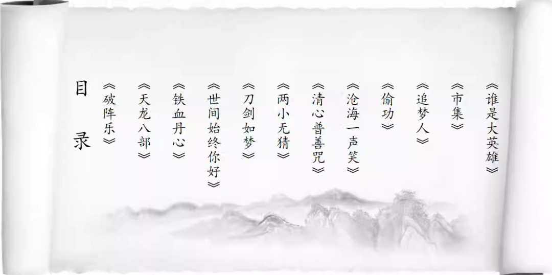 本场音乐会以历史朝代为主线,以经典的武侠人物为素材,以曲艺(画外音)讲述,再现人物故事情节。用观众耳熟能详的武侠音乐重新编配,将民族器乐技巧融合现代音乐元素,用音乐诉说侠客柔情。
