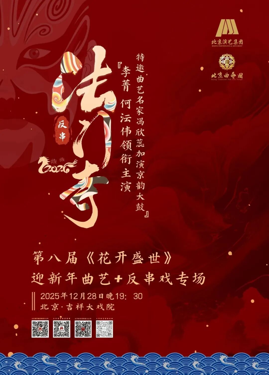新年钟声将至,曲艺盛宴再临!北京曲艺团诚邀您共赴第八届《花开盛世》迎新年专场演出,以鼓曲之韵致敬传统,以相声之趣点亮佳节,更有李菁、何沄伟领衔主演的反串戏《法门寺》掀起新年狂欢。